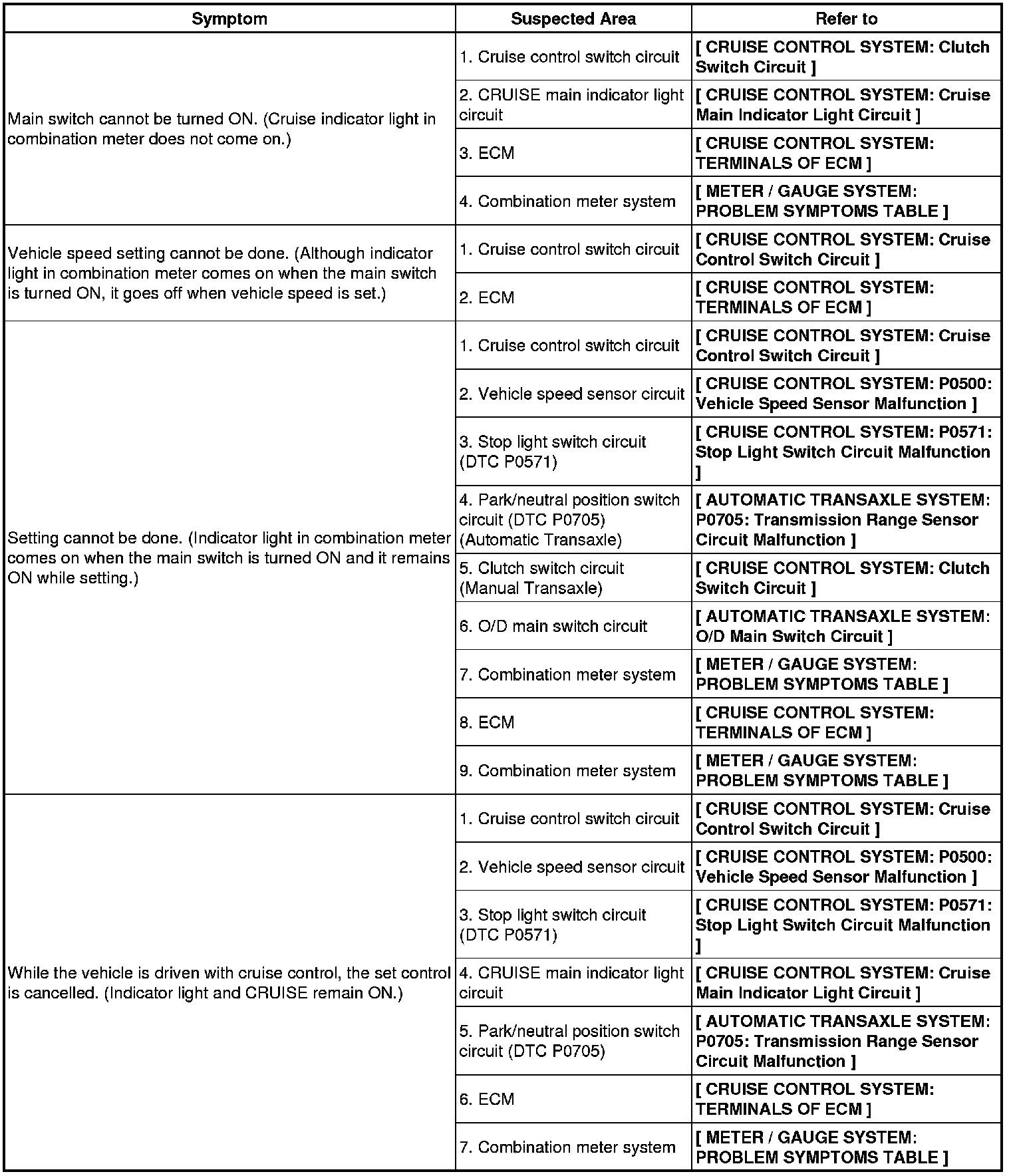 Inspect each malfunction circuit in numerical order for the corresponding symptom.