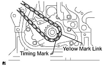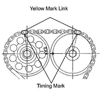 (b) Install the chain onto the crankshaft timing gear with the yellow mark link aligned with the timing mark on the crankshaft timing gear.