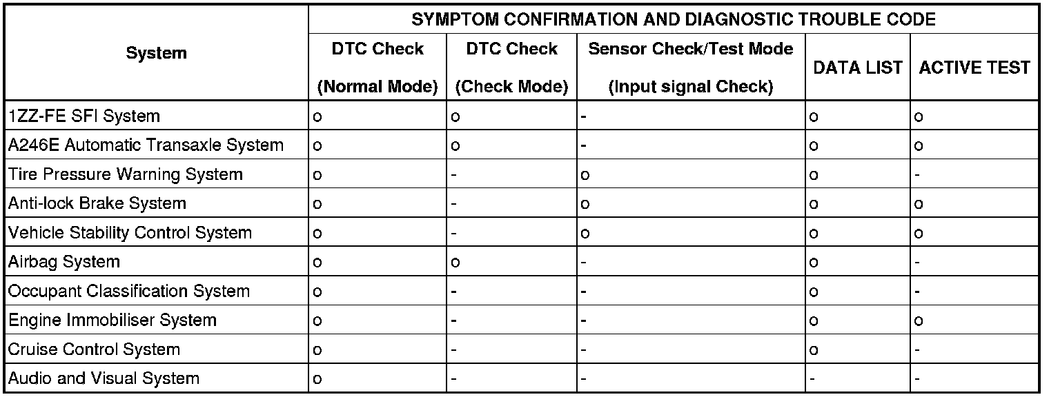 In the symptom simulation test, the problem symptoms as well as the problem area or parts must be confirmed. First, narrow down the possible problem circuits according to the symptoms. Then, connect the tester and carry out the symptom simulation test, judging whether the circuit being tested is defective or normal. Also, confirm the problem symptoms at the same time. Refer to the problem symptoms table for each system to narrow down the possible causes.