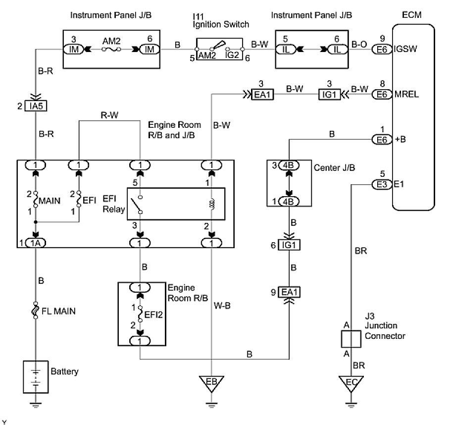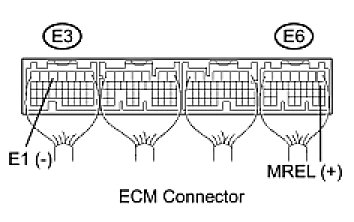 When the ignition switch is turned to the ON position, the battery voltage is applied to terminal IGSW of the ECM. The ECM MREL output signal causes a current to flow to the coil, closing the contacts of the EFI relay and supplying power to terminal +B of the ECM.