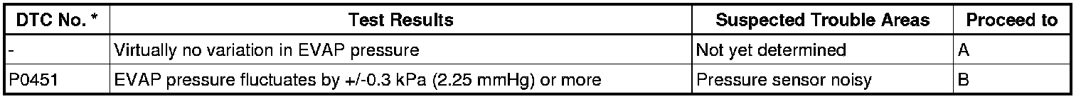 If any EVAP system DTCs are set, the malfunctioning area can be determined using the table below.