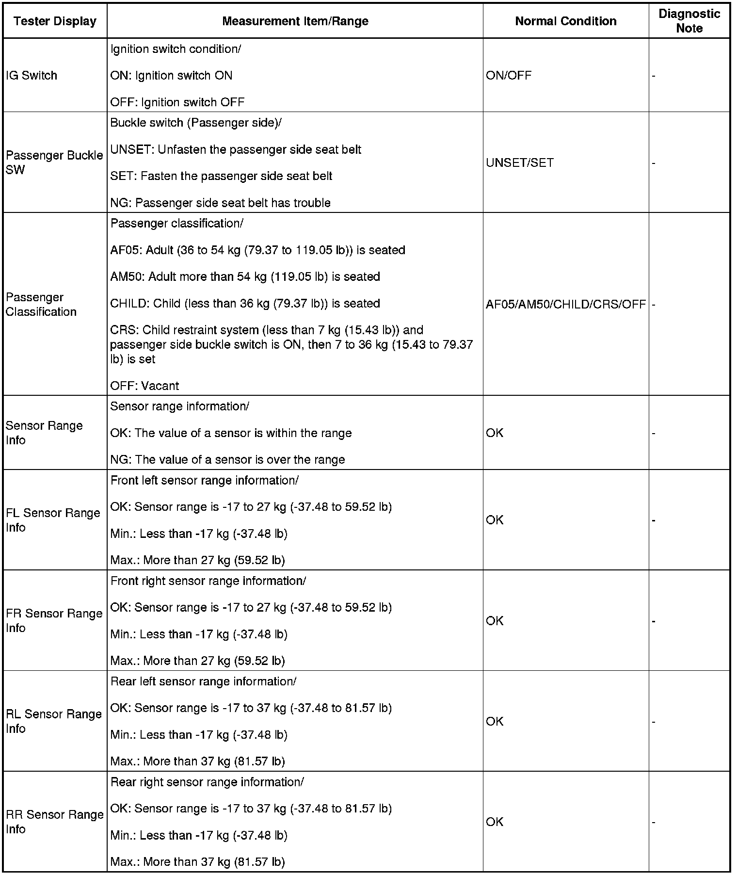 1. DATA LIST FOR OCCUPANT CLASSIFICATION ECU