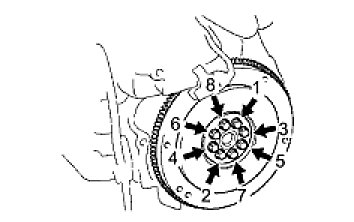 FLYWHEEL SUB-ASSEMBLY (for Manual Transaxle)- Using several steps, uniformly install and tighten the 8 bolts in the sequence shown in the illustration (Procedure "A").
