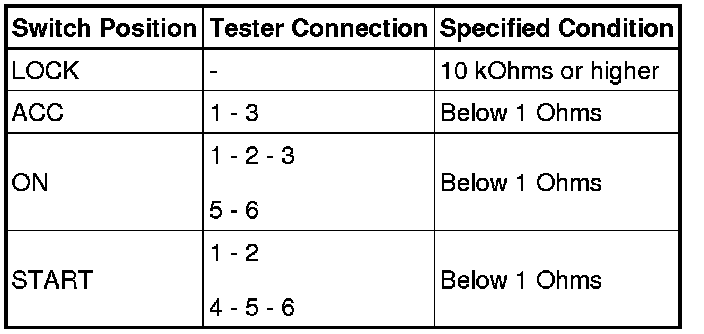 If the result is not as specified, replace the ignition starter switch.