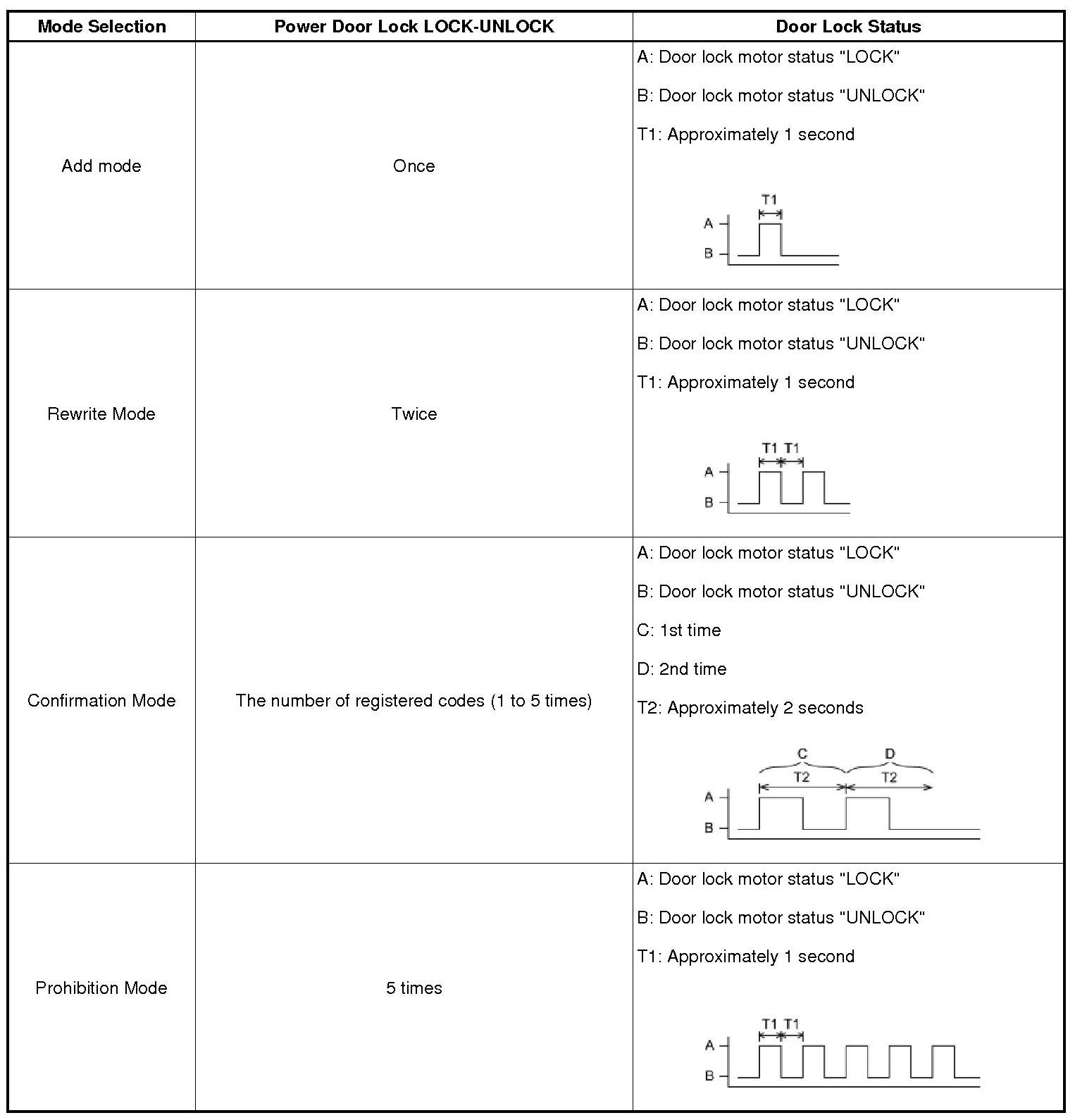 - Prohibition mode is used to erase all the registered codes and disable the wireless door lock function. This mode is used when the transmitter is lost.