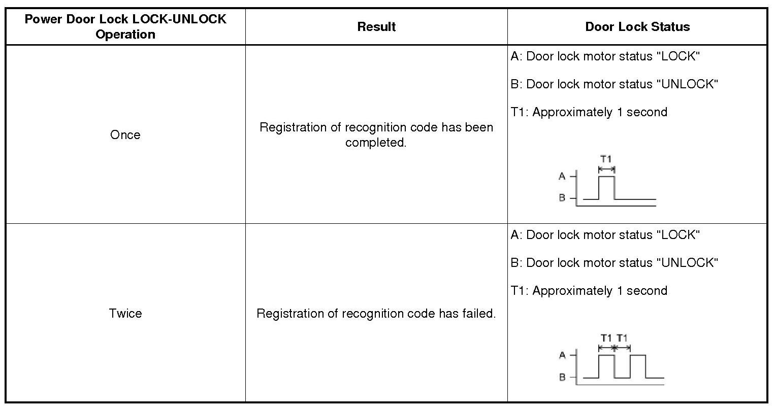 (m) The multiplex network body ECU automatically performs power door LOCK-UNLOCK operations to show whether registration has been completed correct or not within 3 seconds after Procedure "I".