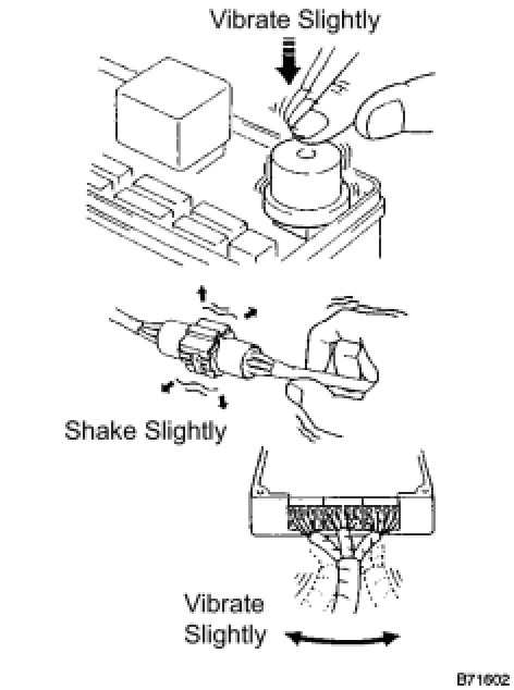 With a problem that only occurs when the engine is cold or as a result of vibration caused by the road during driving, the problem can never be determined if the symptoms are being checked on a stationary vehicle or on a vehicle with a warmed-up engine. Vibration, heat or water penetration (moisture) is difficult to reproduce. The symptom simulation tests below are effective substitutes for the conditions and can be applied on a stationary vehicle.