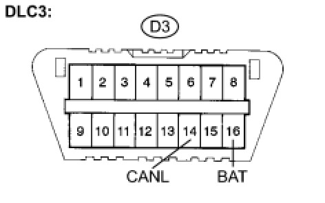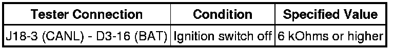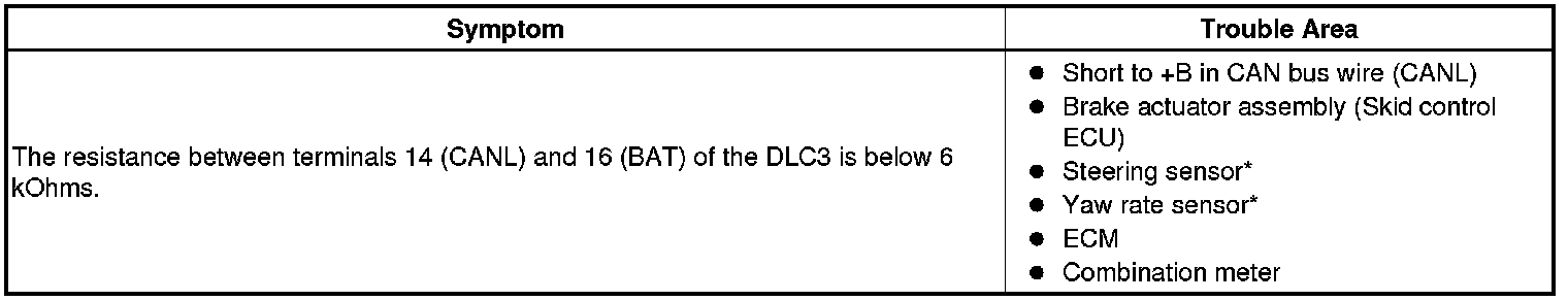 A short to +B is suspected in the CAN bus wire when the resistance between terminals 14 (CANL) and 16 (BAT) of the DLC3 is below 6 kOhms.