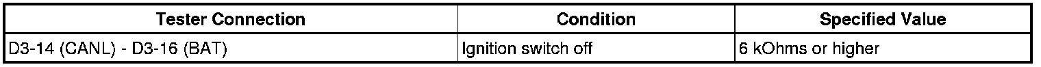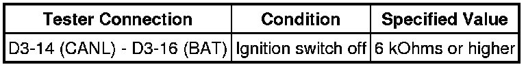 (b) Measure the resistance between terminals 14 (CANL) and 16 (BAT) of the DLC3 each time a connector is disconnected.