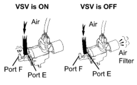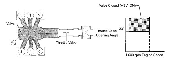 The ECM opens and closes the Intake Air Control (IAC) valve No. 2 in response to engine speed (RPM/NE). This system improves intake manifold tuning for better efficiency at low and high engine rpm. When the engine speed is 4,000 rpm or less and the throttle valve opening angle is 30° or more, the ECM turns the VSV ON to operate the IAC valve.