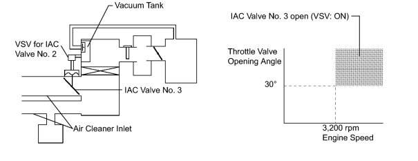 When the engine is operating at low to mid speeds, this system operates the IAC valve to close one of the air cleaner inlets. When the engine speed is more than 3,200 rpm and the opening angle of the throttle valve is more than 30°, the ECM activates the VSV and opens the IAC valve No. 3.
