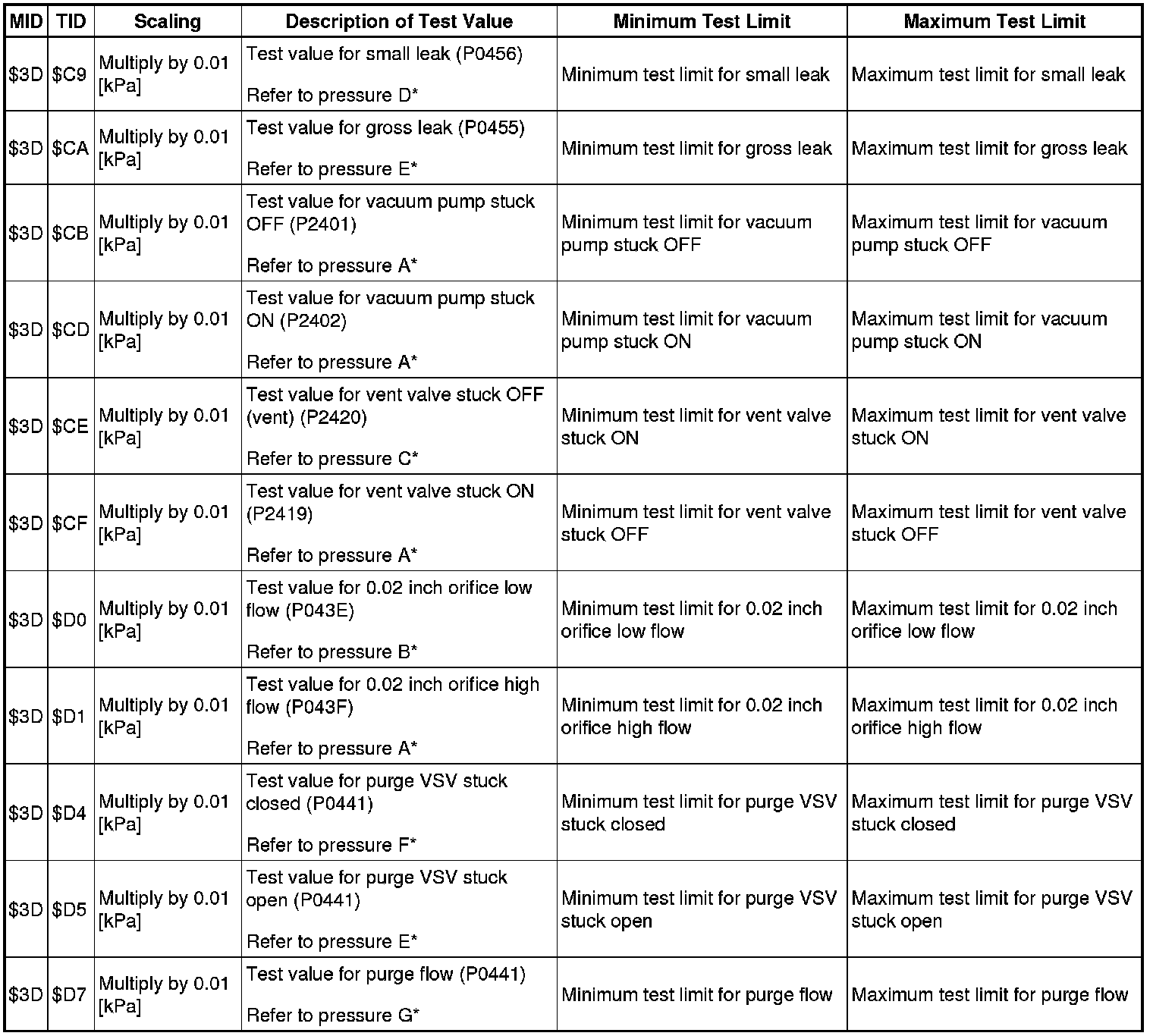 - The test value and test limit information are described as shown in the following table. This information is included in Monitor Result of the emissions-related DTC sections: