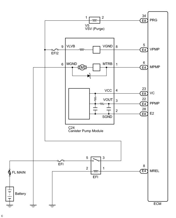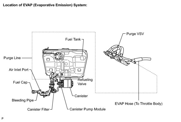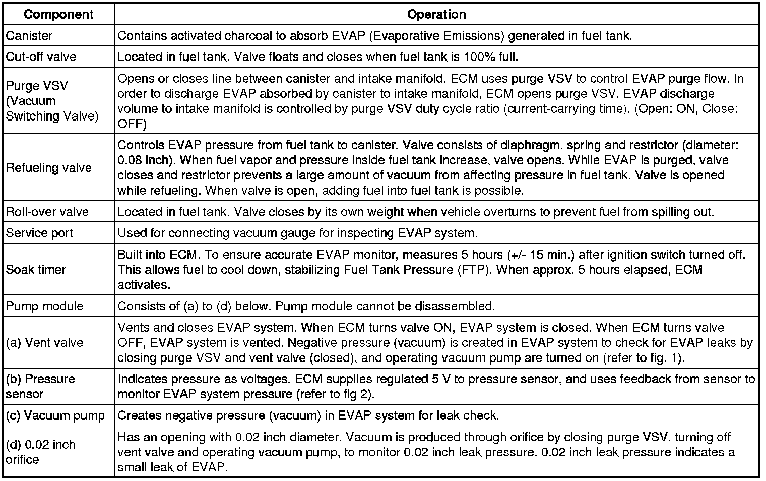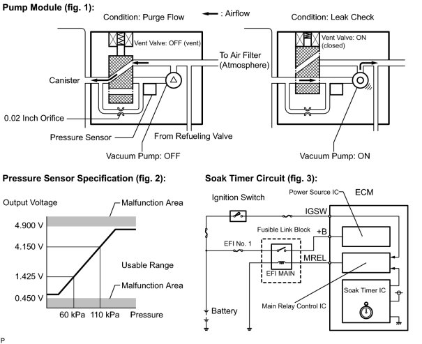 The electric vacuum pump creates negative pressure (vacuum) in the EVAP system, and the pressure is measured. Finally, the ECM monitors for leaks from the EVAP system and malfunctions in both the pump module and purge VSV, based on the EVAP pressure.