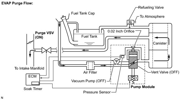 While the engine is running and the purge VSV (Vacuum Switching Valve) is ON (open), the ECM monitors the purge flow by measuring the EVAP pressure change. If negative pressure is not created, the ECM begins the 2nd monitor.