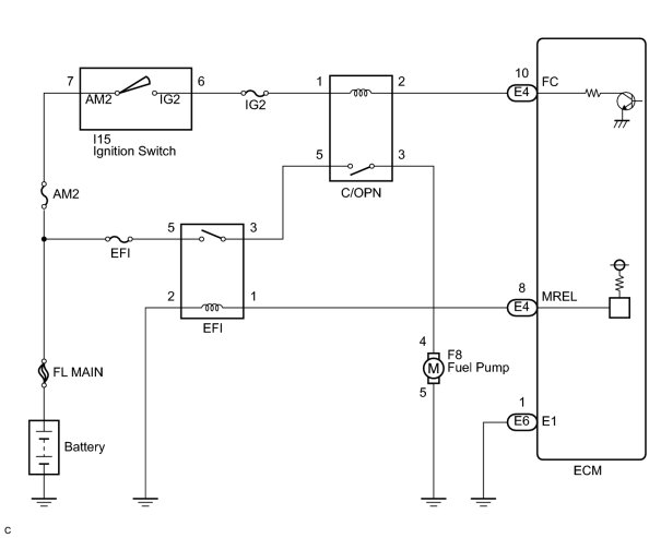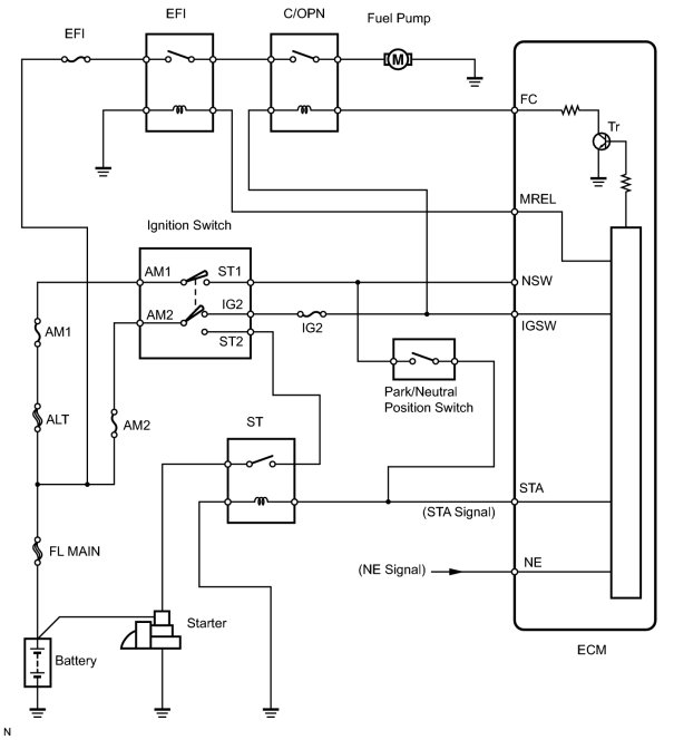 When the STA signal and NE signal are input to the ECM, Tr is turned ON, current flows to coil of the circuit opening relay (marking: C/OPN), the relay switches ON, power is supplied to the fuel pump and the fuel pump operates.