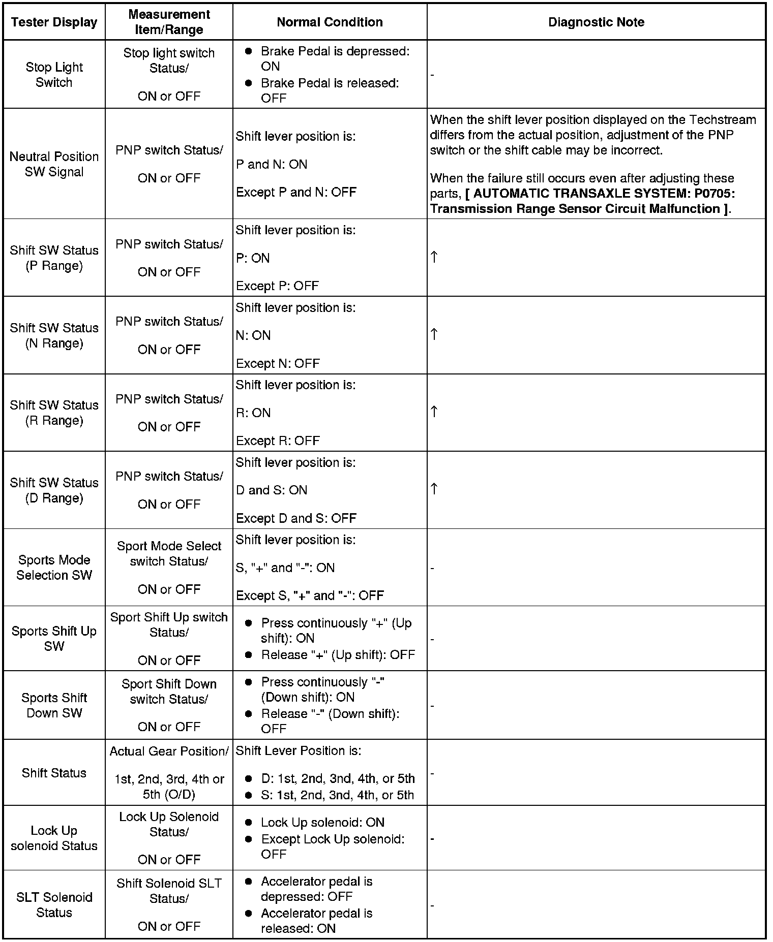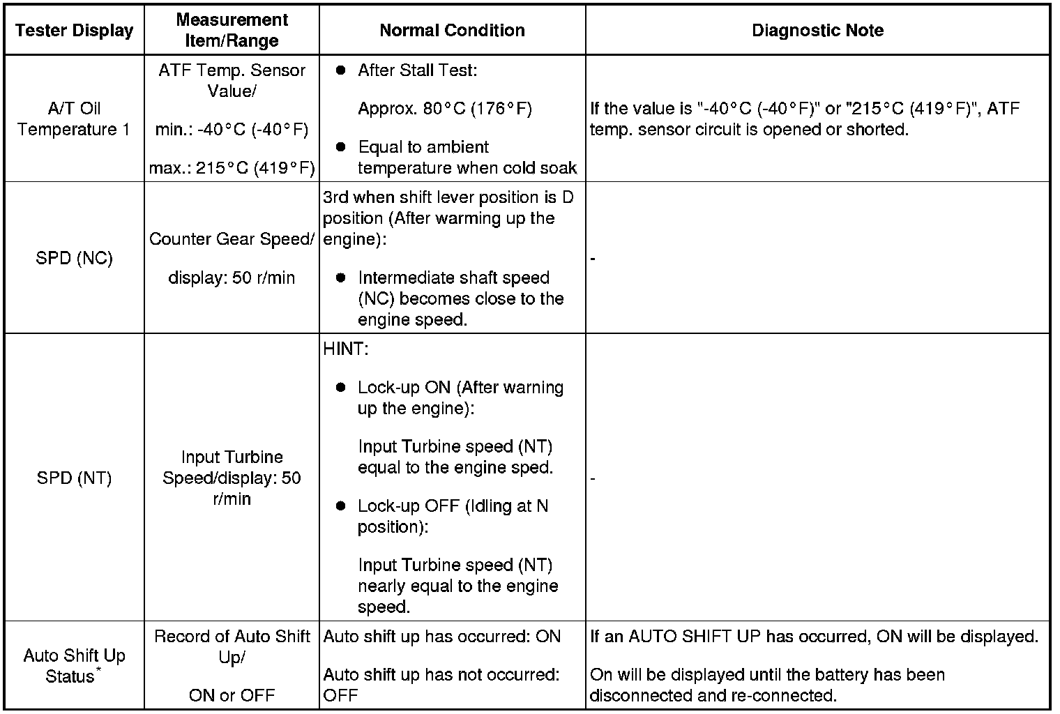 *: "Auto Shift Up Status" will occur (4th range will be automatically selected) if the engine coolant temperature exceeds a specified level while driving with the shift lever in the S position and the shift range is 3rd or lower. The ECU stores this condition as a record as long as power is supplied to it. Disconnecting the cable from the negative battery terminal will clear the record.