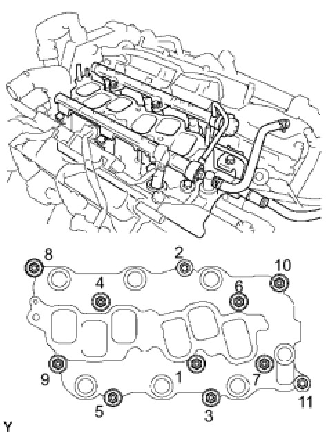 INTAKE MANIFOLDInstall the intake manifold with the 9 bolts, 2 nuts and 2 washers. Uniformly tighten the bolts and nuts in the sequence shown in the illustration.