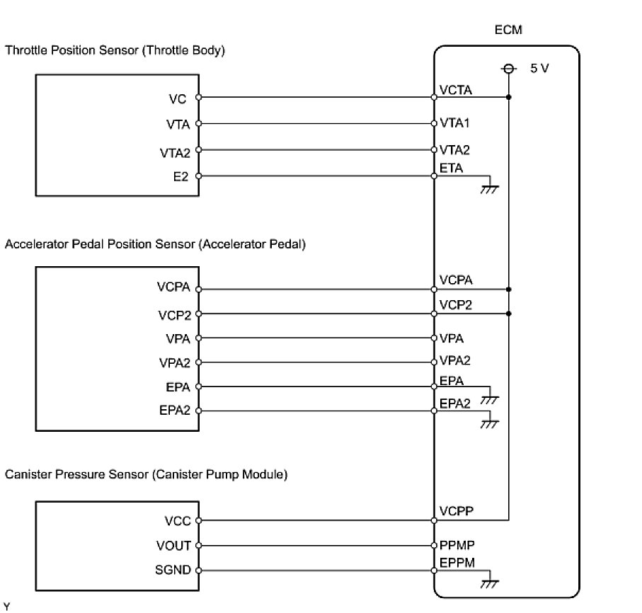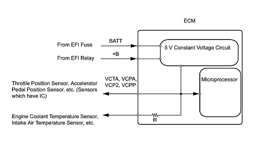 The ECM constantly generates 5 V power from the battery voltages supplied to the +B (BATT) terminal to operate the microprocessor. The ECM also provides this power to the sensors through the VC output circuit.