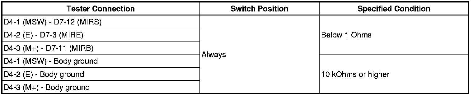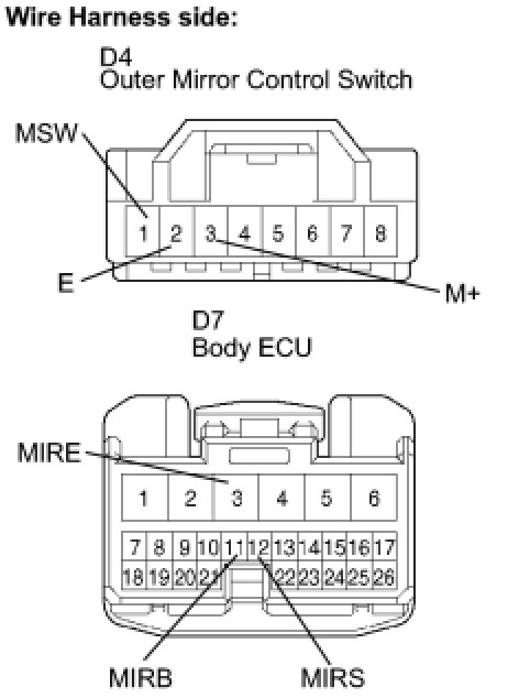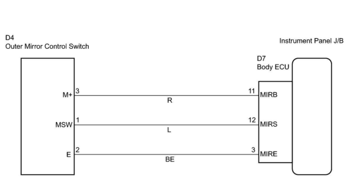HINT: The power mirror control system is part of the multiplex communication system. This system features shared communication wiring that reduces the wiring complexity of the communication lines. The first step in any repair is to confirm the proper operation of the communication system. Proceed with troubleshooting after the communication has been verified (See Multiplex Communication System). WIRING DIAGRAM