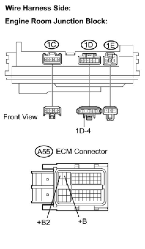 When the ignition switch is turned to ON, voltage from the ECM's MREL terminal applies to the engine room junction block (EFI relay). This causes the contacts of the engine room junction block (EFI relay) to close, which supplies power to terminal +B or +B1 of the ECM.