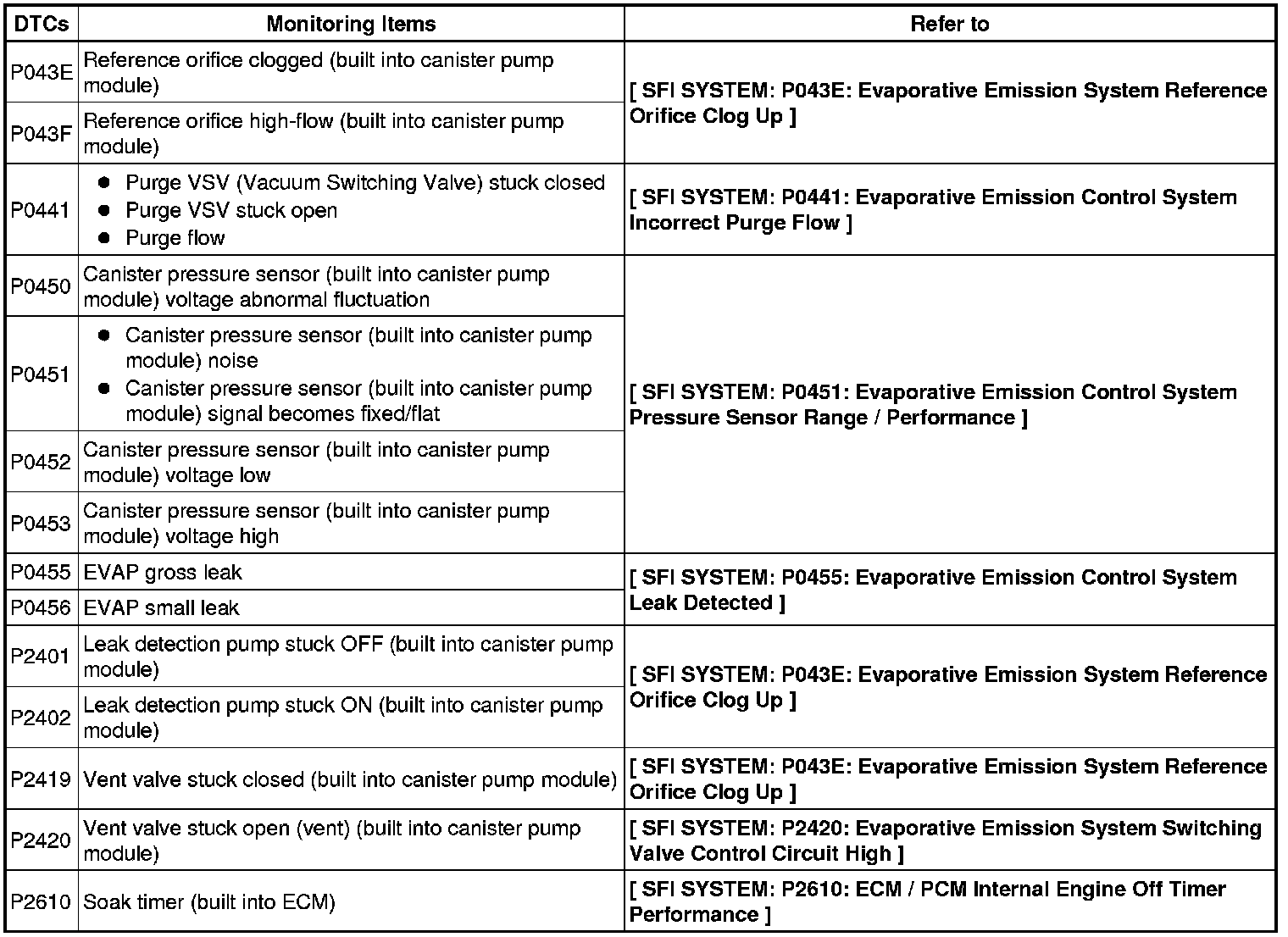 If any EVAP system DTCs are set, the malfunctioning area can be determined using the table below.