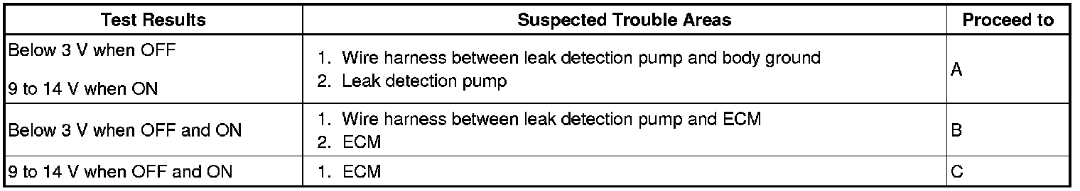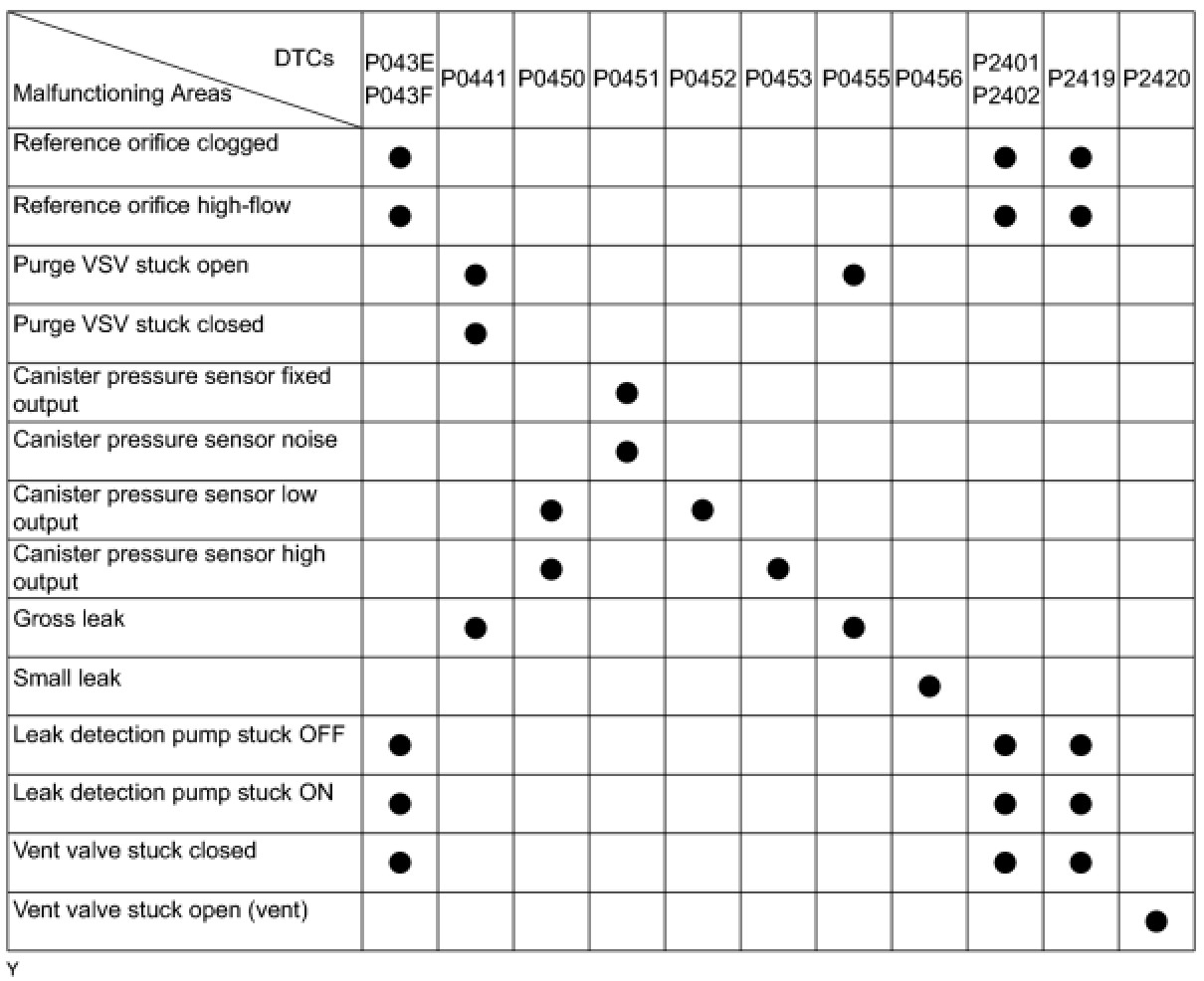If any EVAP system DTCs are set, the malfunctioning area can be determined using the table below.