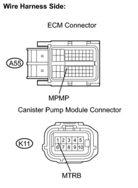 (d) Measure the resistance between the MPMP terminal of the ECM connector and the MTRB terminal of the canister pump module connector.
