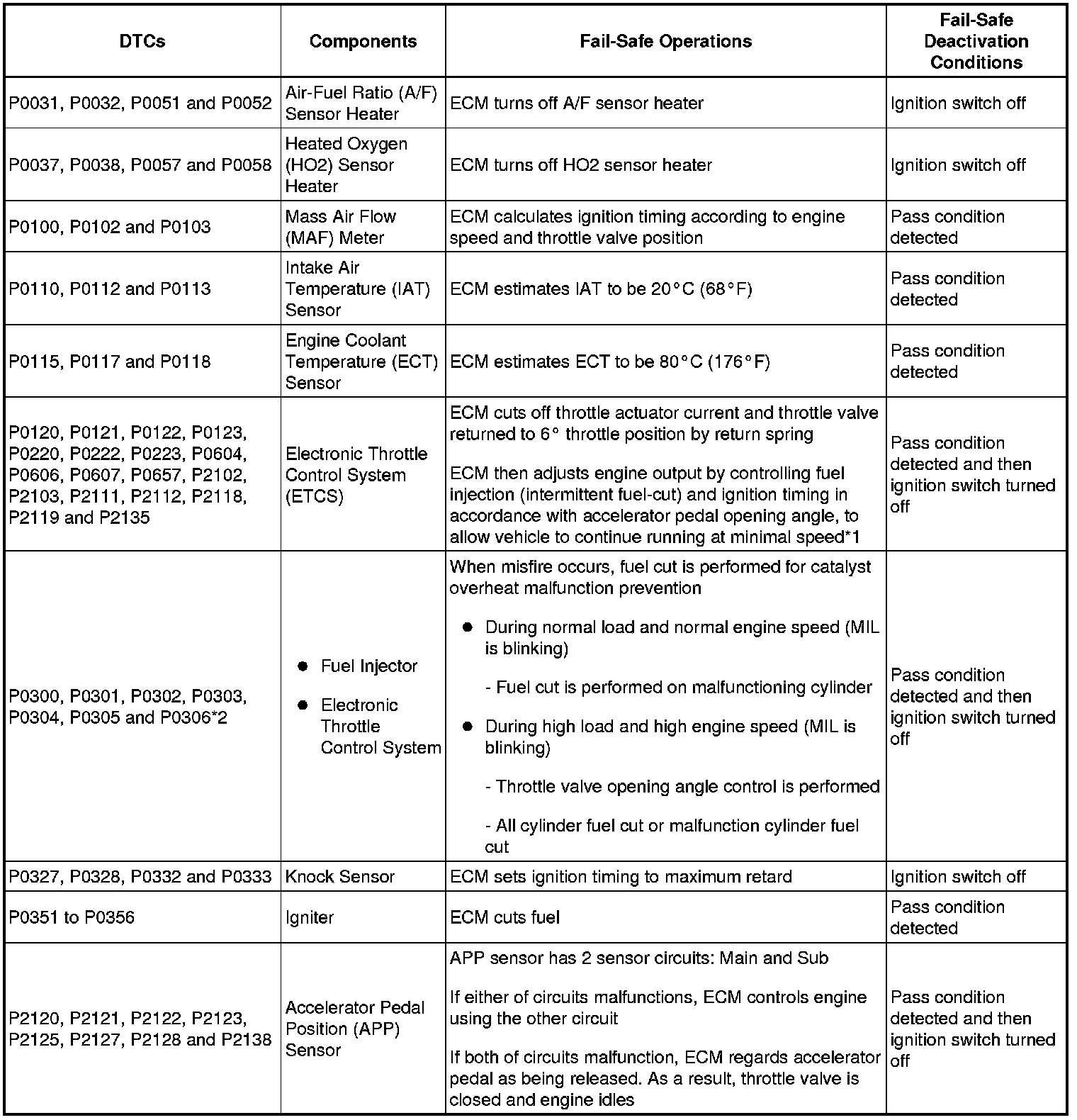 If any of the following DTCs are set, the ECM enters fail-safe mode to allow the vehicle to be driven temporarily.