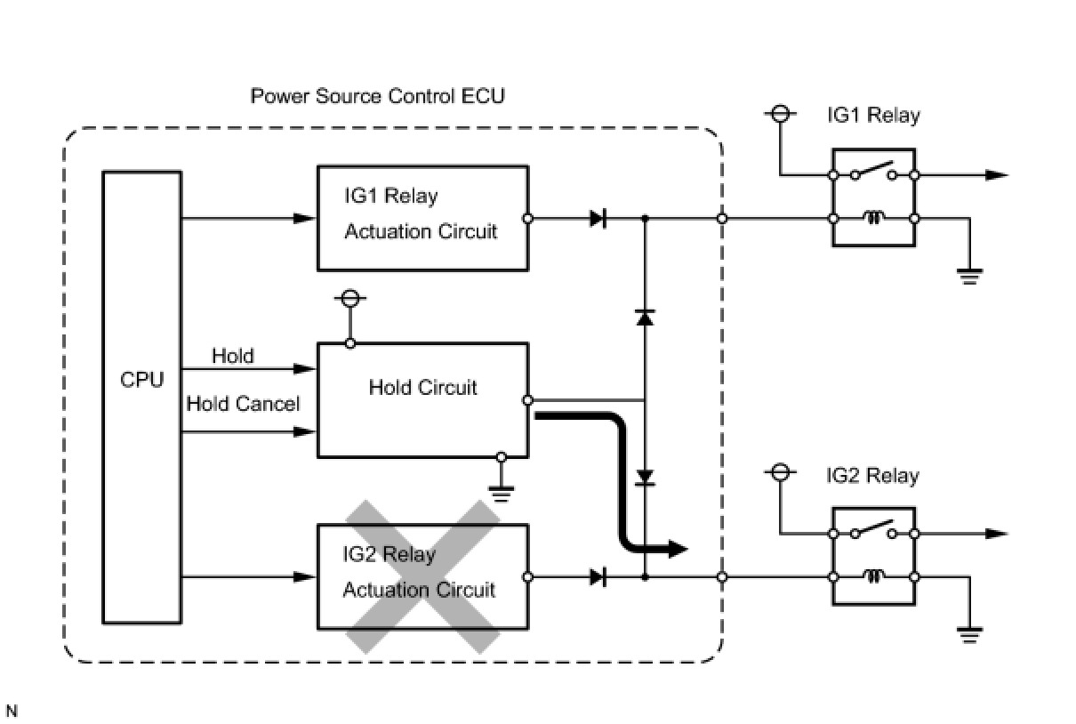 Power Source Control ECU consists of the IG1 and IG2 relay actuation circuits, CPU and hold circuit.