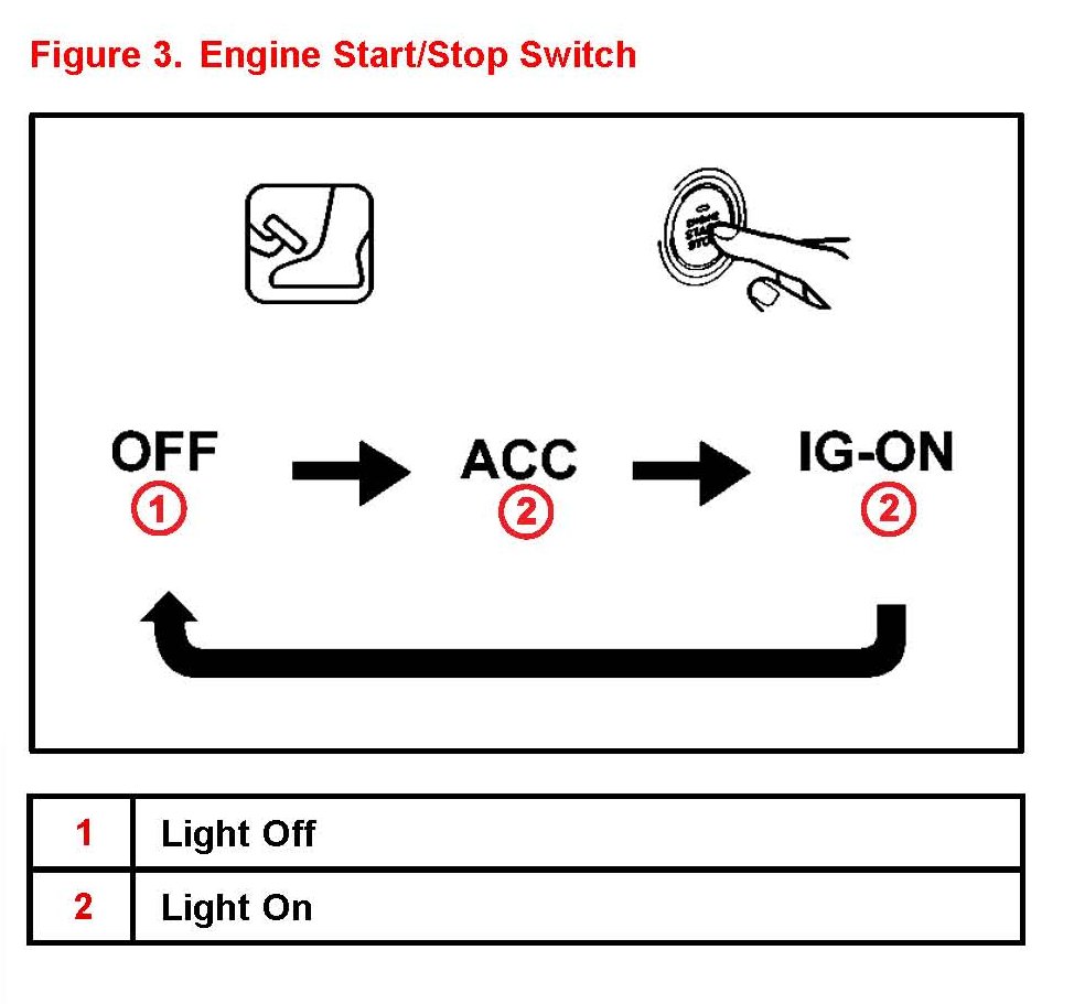(2) Without depressing the brake pedal, press the "ENGINE START/STOP" switch and confirm the mode changes properly. From the "OFF" mode: