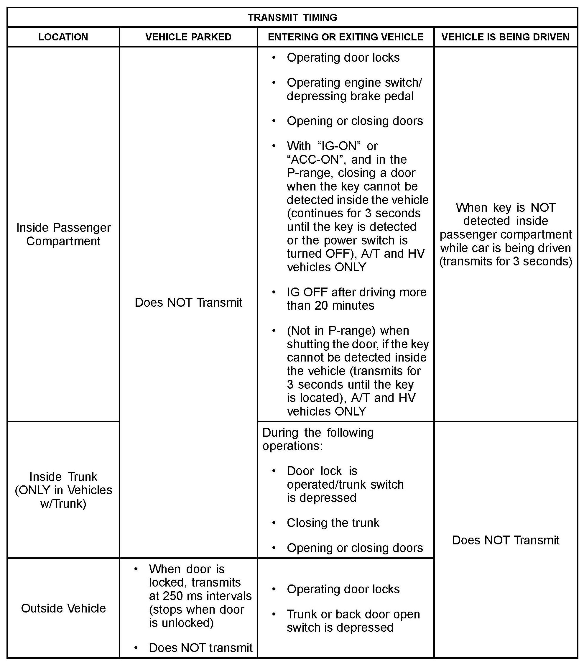 Some customers may inquire about the frequency and power output of the SmartKey/Smart Entry Systems used on various models. The Smart Key/Smart Entry systems conform to all applicable FCC rules. This bulletin details the applicable specifications for these systems.