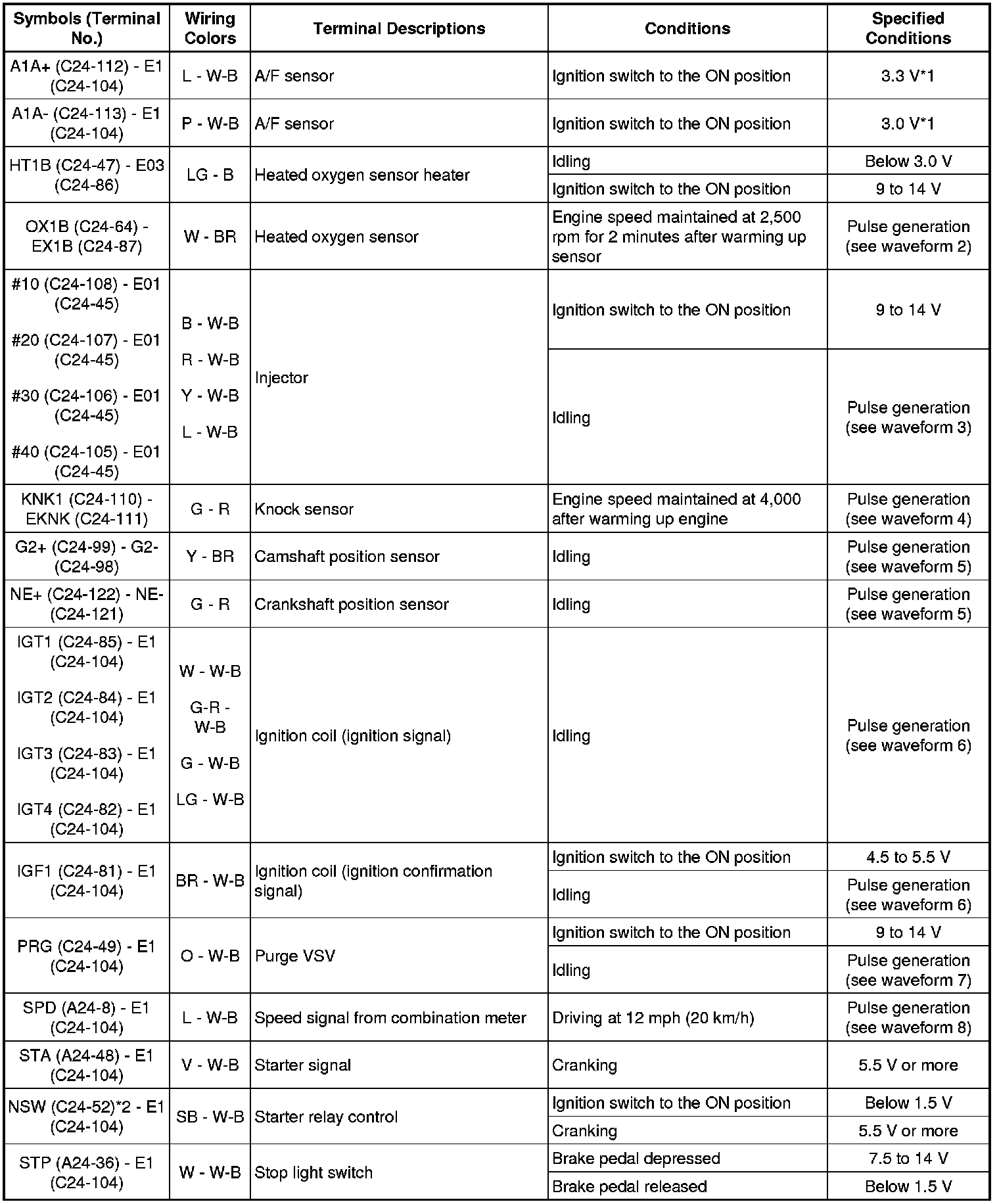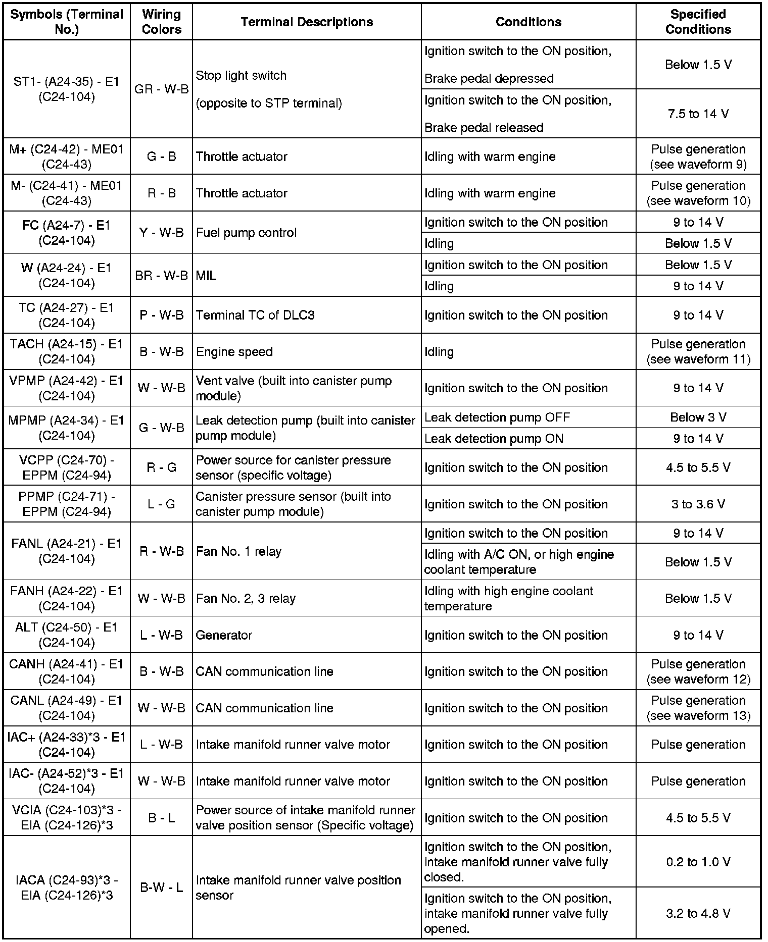 HINT: The standard normal voltage between each pair of the ECM terminals is shown in the table below. The appropriate conditions for checking each pair of the terminals are also indicated. The result of checks should be compared with the standard normal voltage for that pair of the terminals, displayed in the Specified Condition column. The illustration above can be used as a reference to identify the ECM terminal locations.