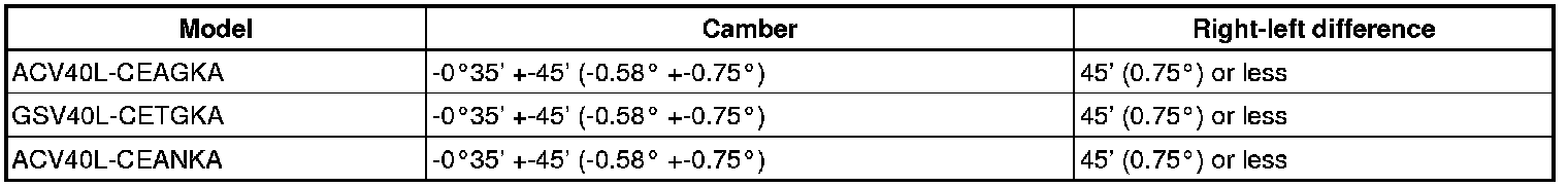 The body and suspension may be damaged if the camber is not correctly adjusted according to the above table.