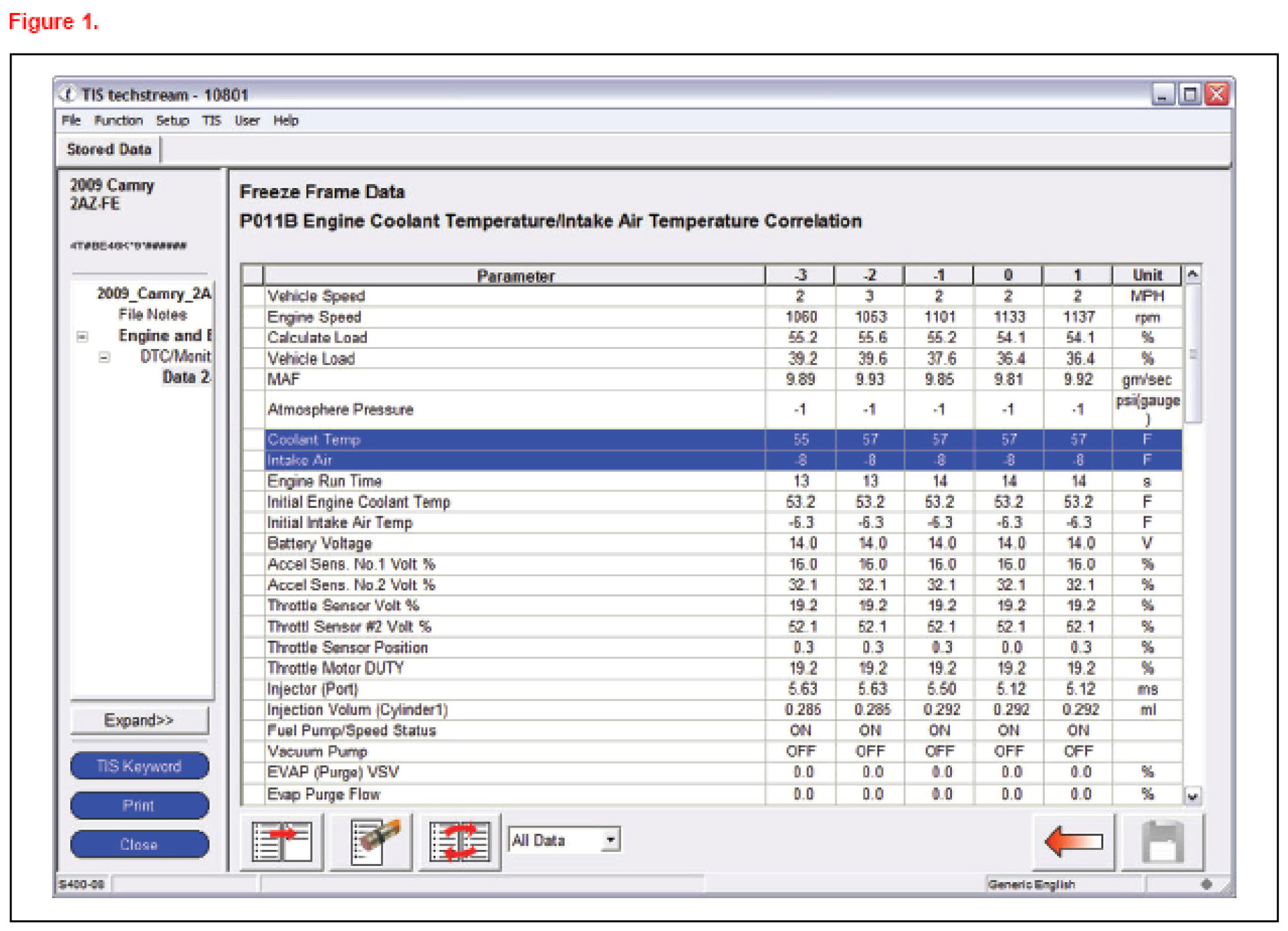 2. Review the Freeze Frame Data (FFD) and compare the "Coolant Temp" value to the "Intake Air" value.