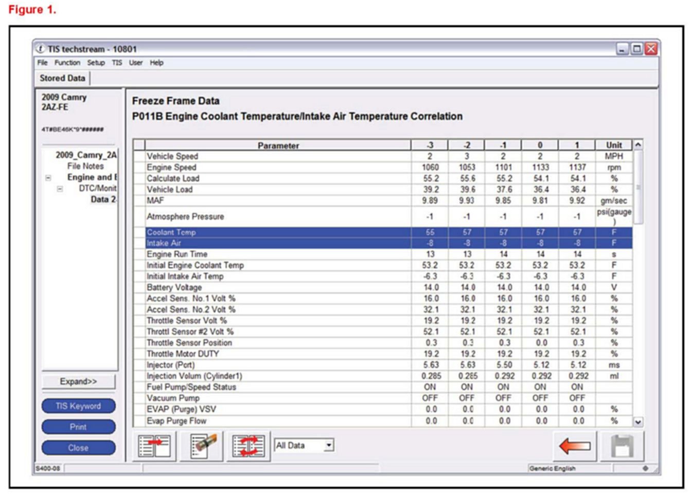 2. Review the Freeze Frame Data (FFD) and compare the "Coolant Temp" value to the "Intake Air" value.