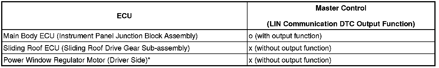 The multiplex communication system (LIN) is used to control communication between the ECUs of the body system. If communication cannot be performed through LIN because of an open in the communication lines or other reason, the master control ECU of the relevant system will output a DTC. For the communication system and the connected ECUs, refer to the table below.
