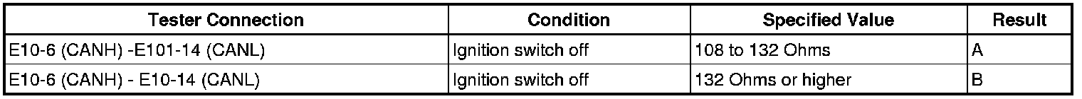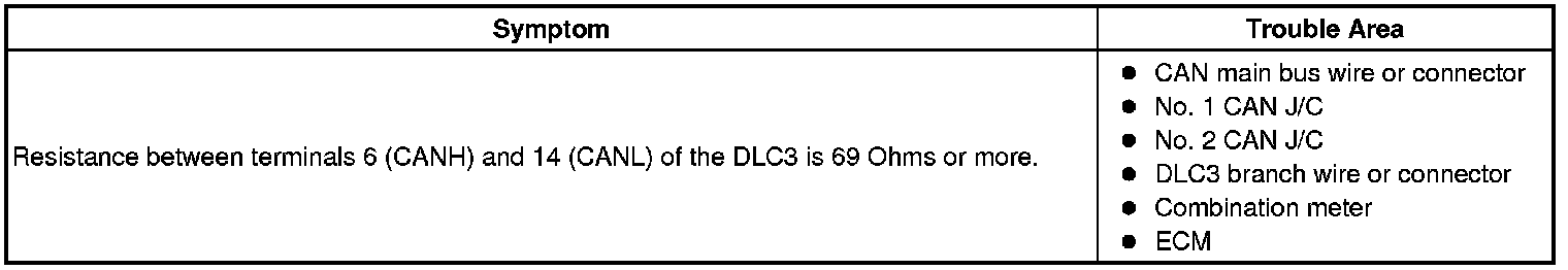 There may be an open circuit in the CAN main bus wire and/or the DLC3 branch wire when the resistance between terminals 6 (CANH) and 14 (CANL) of the DLC3 is 69 Ohms or more.