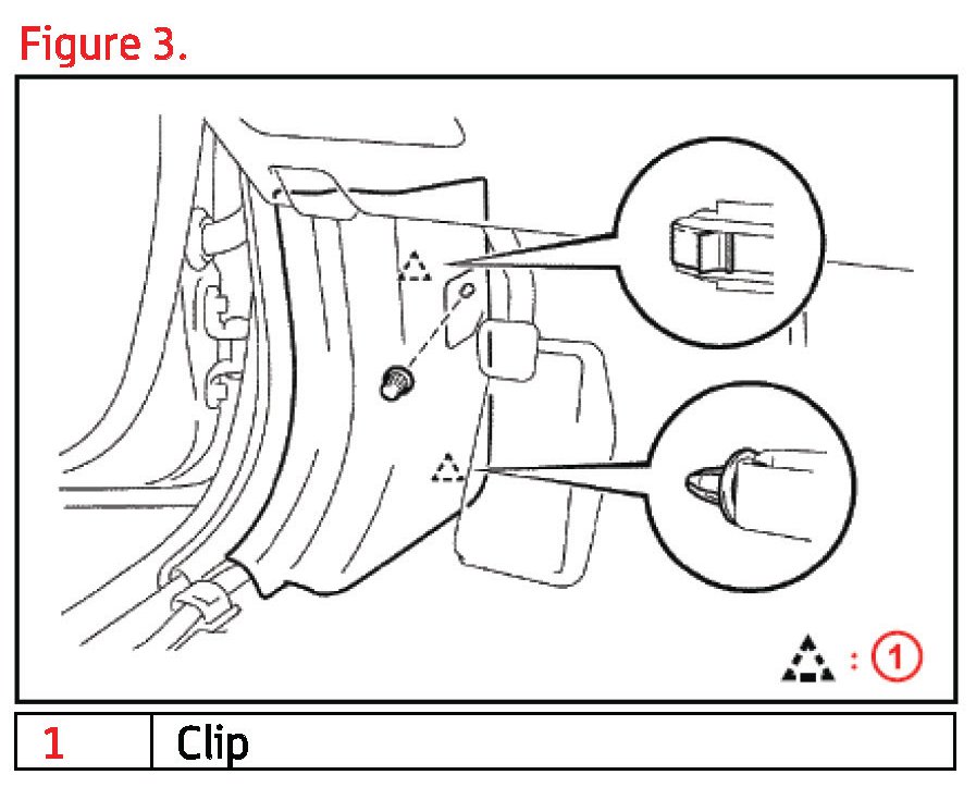 3. Remove the LH front door scuffle plate by disengaging the 7 claws and 4 clips.