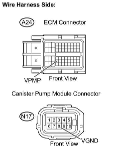 (c) Measure the resistance between the VPMP terminal of the ECM connector and the VGND terminal of the canister pump module connector.
