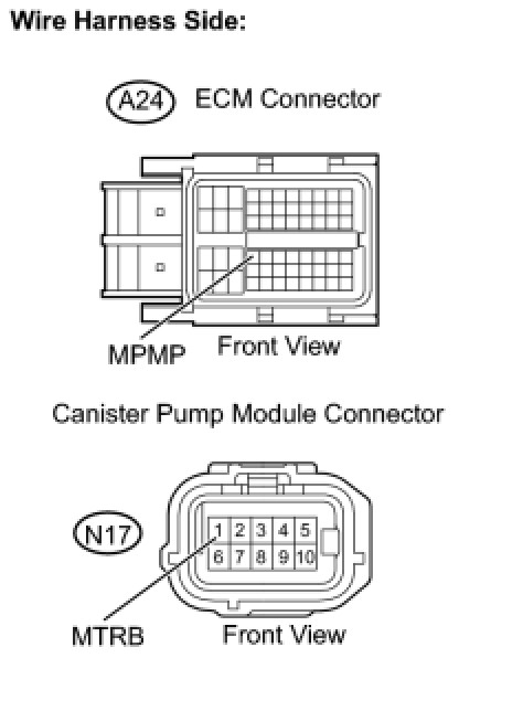 (d) Measure the resistance between the MPMP terminal of the ECM connector and the MTRB terminal of the canister pump module connector.