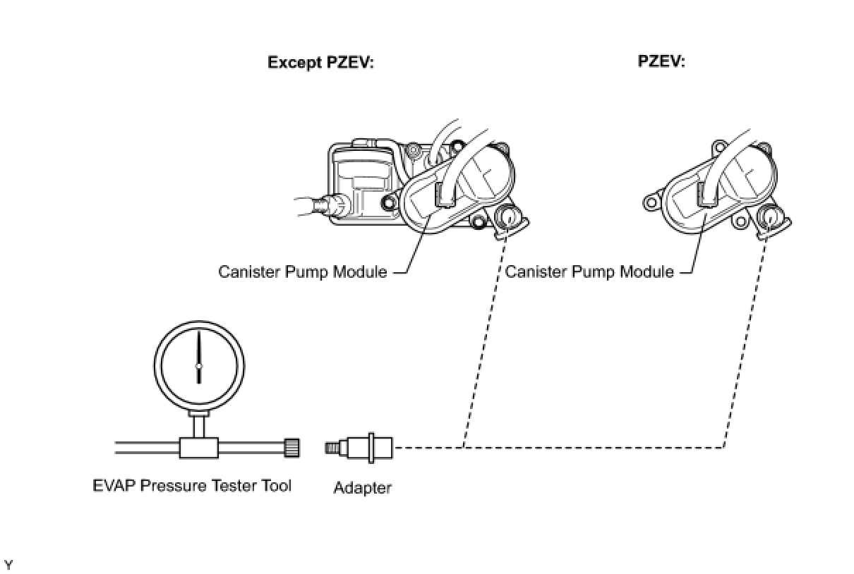 (b) Connect the EVAP pressure tester tool to the canister pump module with the adapter.