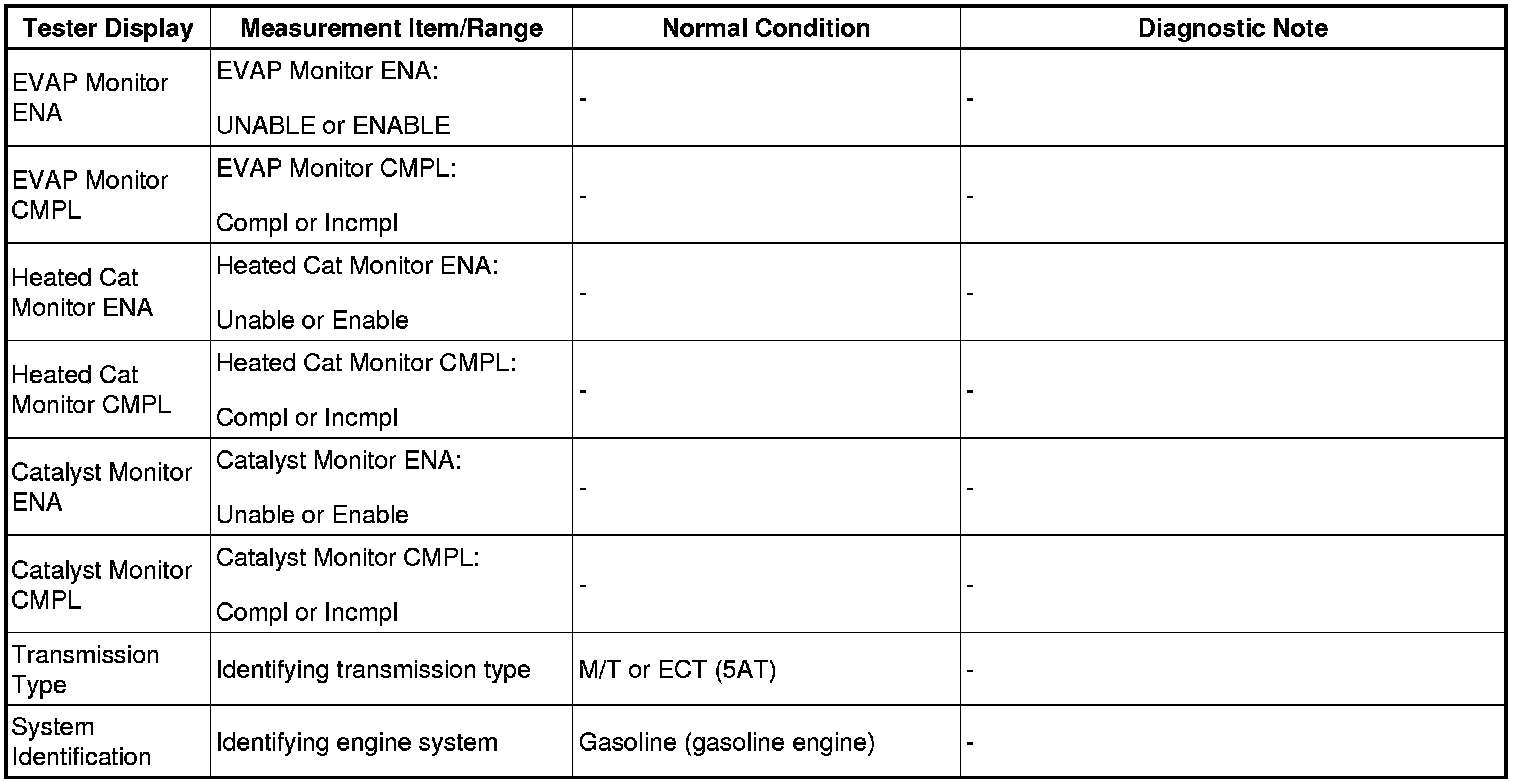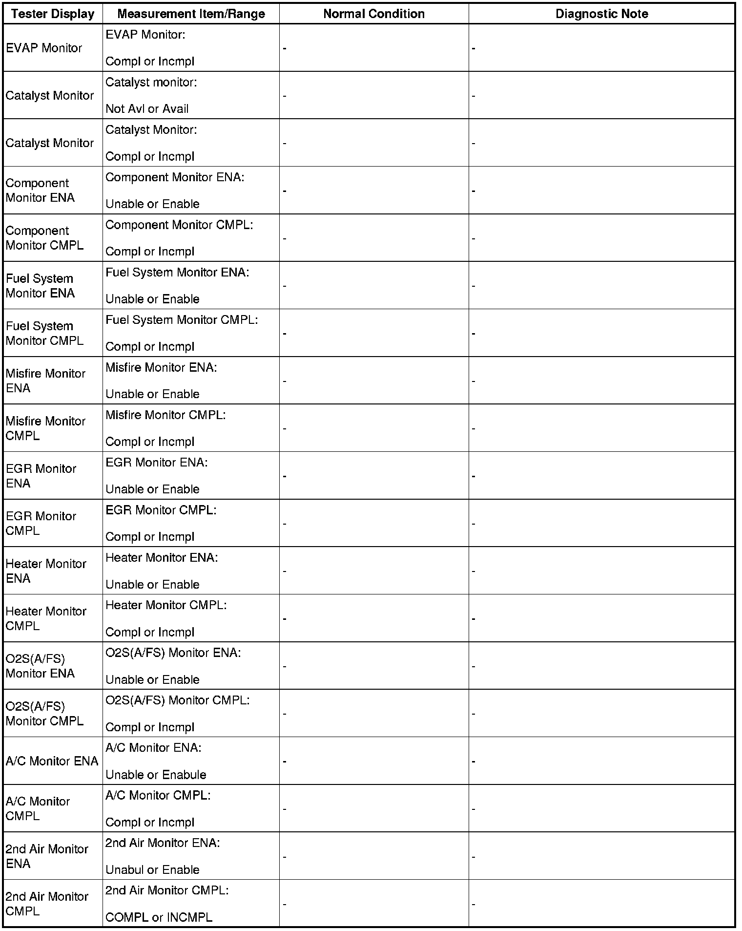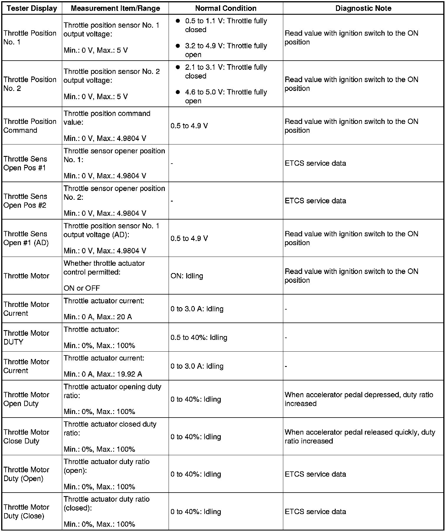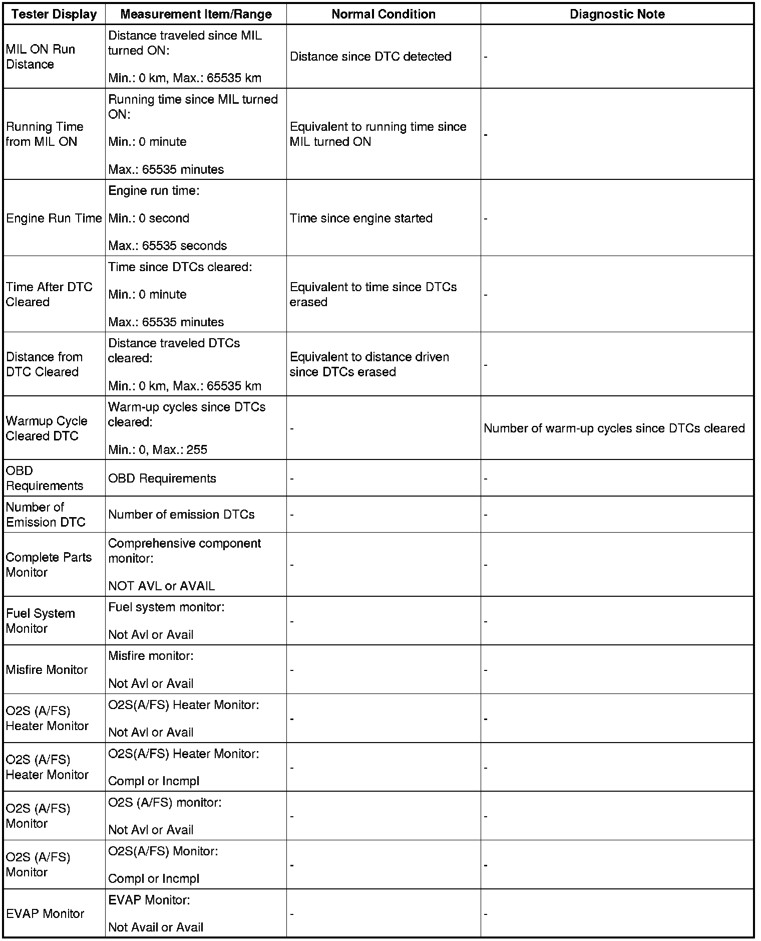 NOTICE: In the table below, the values listed under Normal Condition are for reference only. Do not depend solely on these values when determining whether or not a part is faulty.