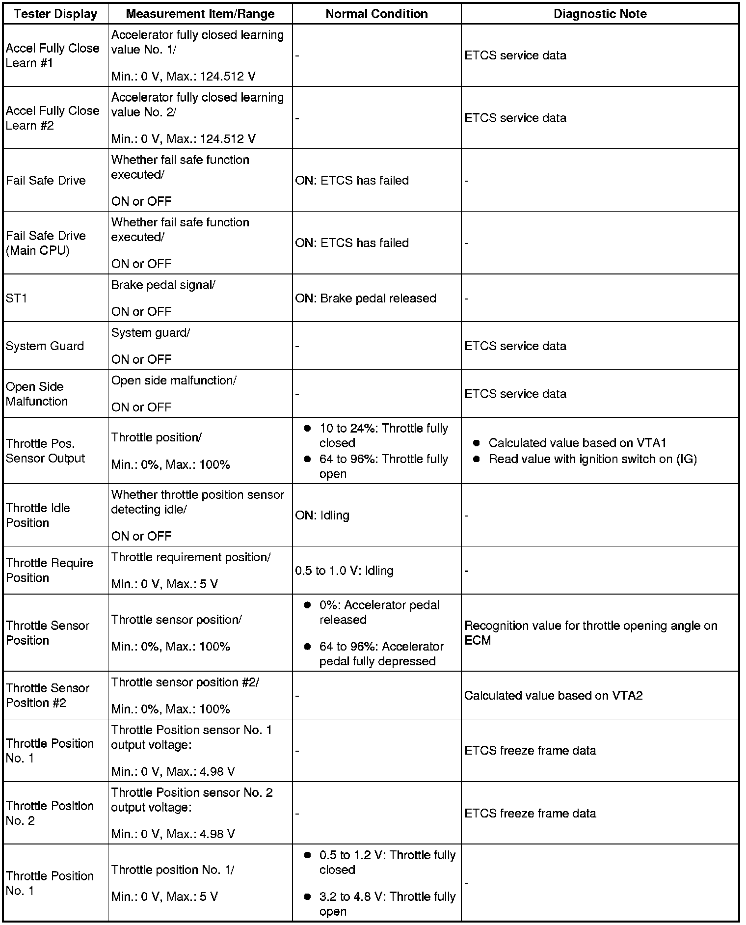 NOTICE: In the table below, the values listed under Normal Condition are reference only. Do not depend solely on these values when determining whether or not a part is faulty.
