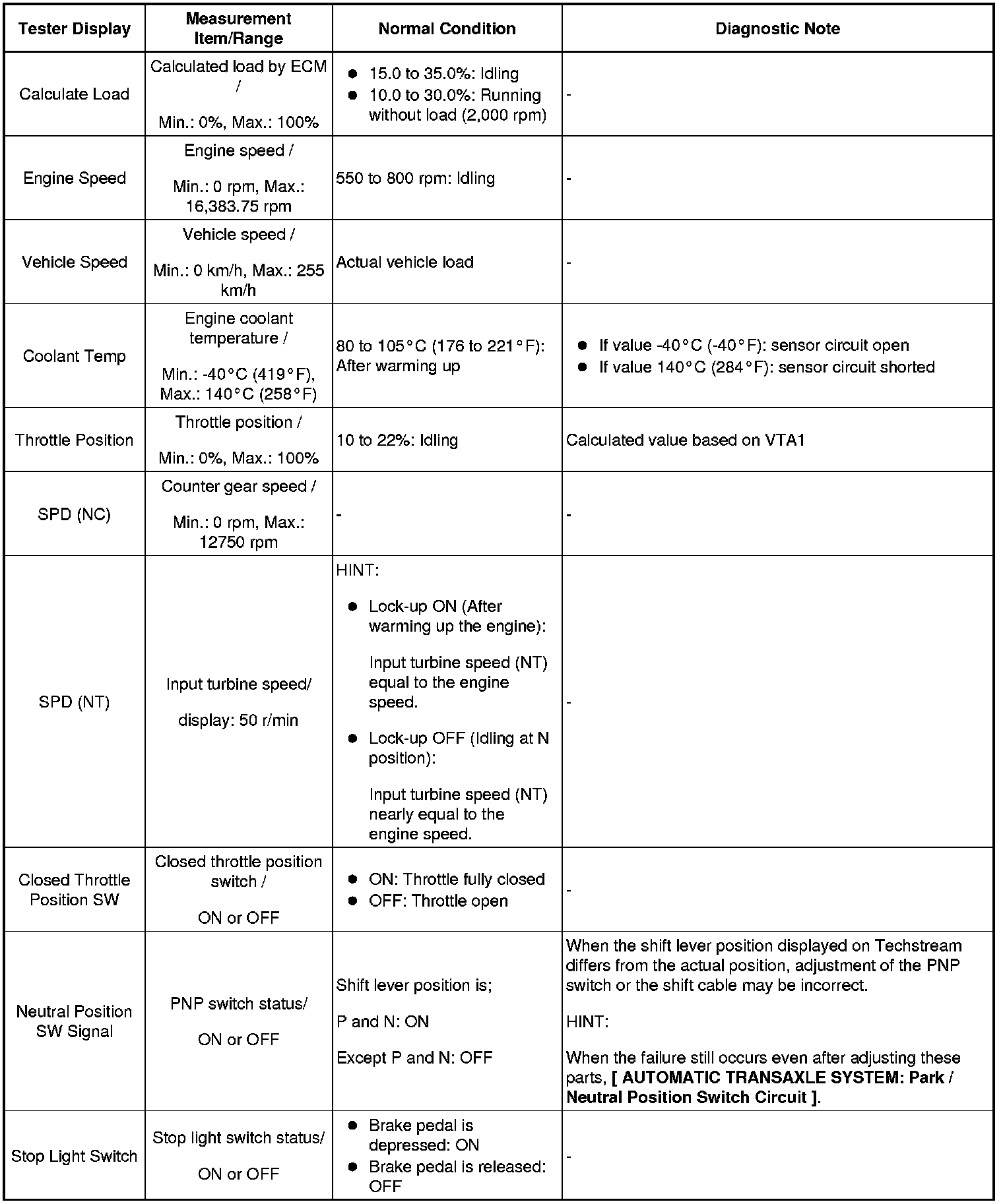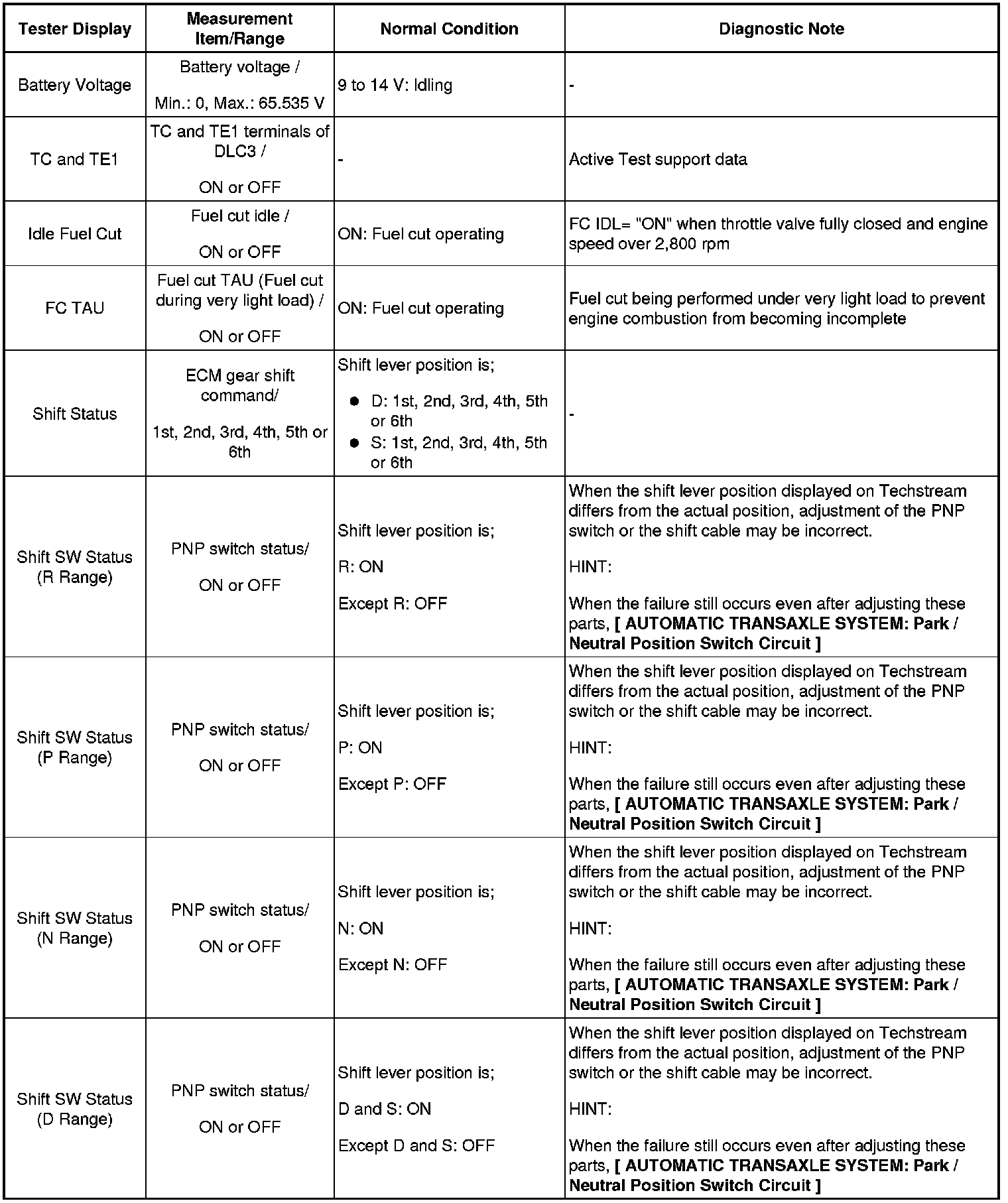 HINT: Using Techstream to read the Data List allows the values or states of switches, sensors, actuators and other items to be read without removing any parts. This non-intrusive inspection can be very useful because intermittent conditions or signals may be discovered before parts or wiring is disturbed. Reading the Data List information early in troubleshooting is one way to save diagnostic time.