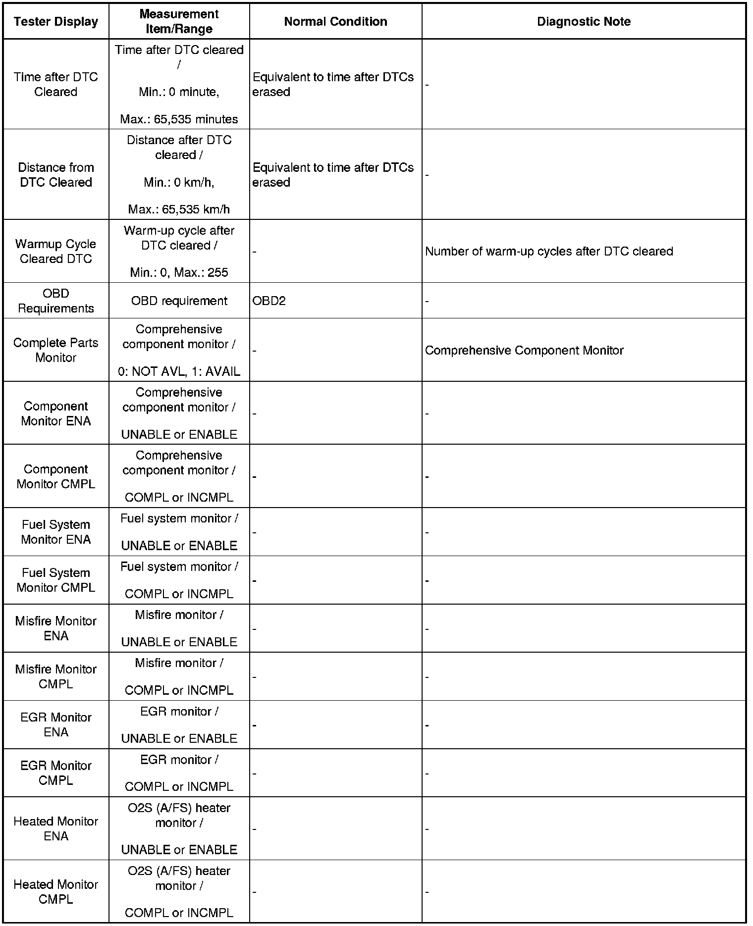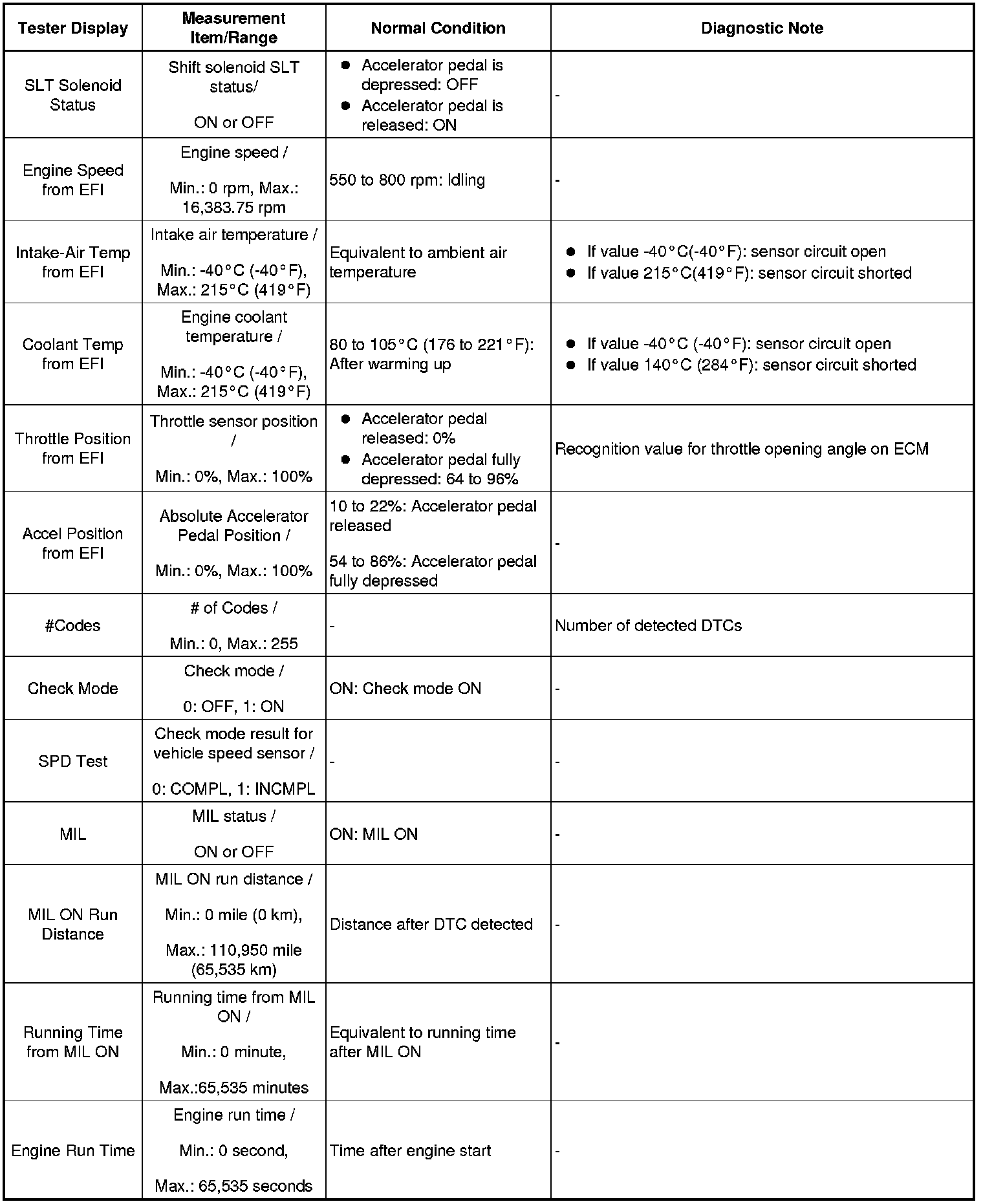 NOTICE: In the table below, the values listed under "Normal Condition" are reference values. Do not depend solely on these reference values when deciding whether a part is faulty.
