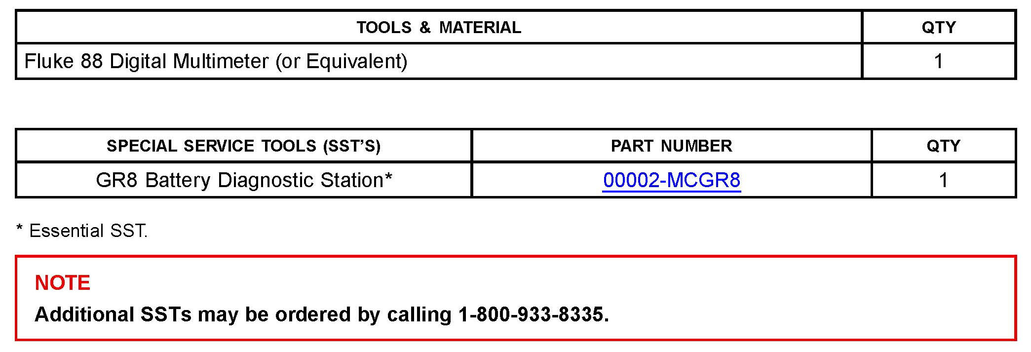 1. Before proceeding determine the battery state of charge (SOC) using the GR8 Battery Diagnostic Station. If necessary charge the battery.