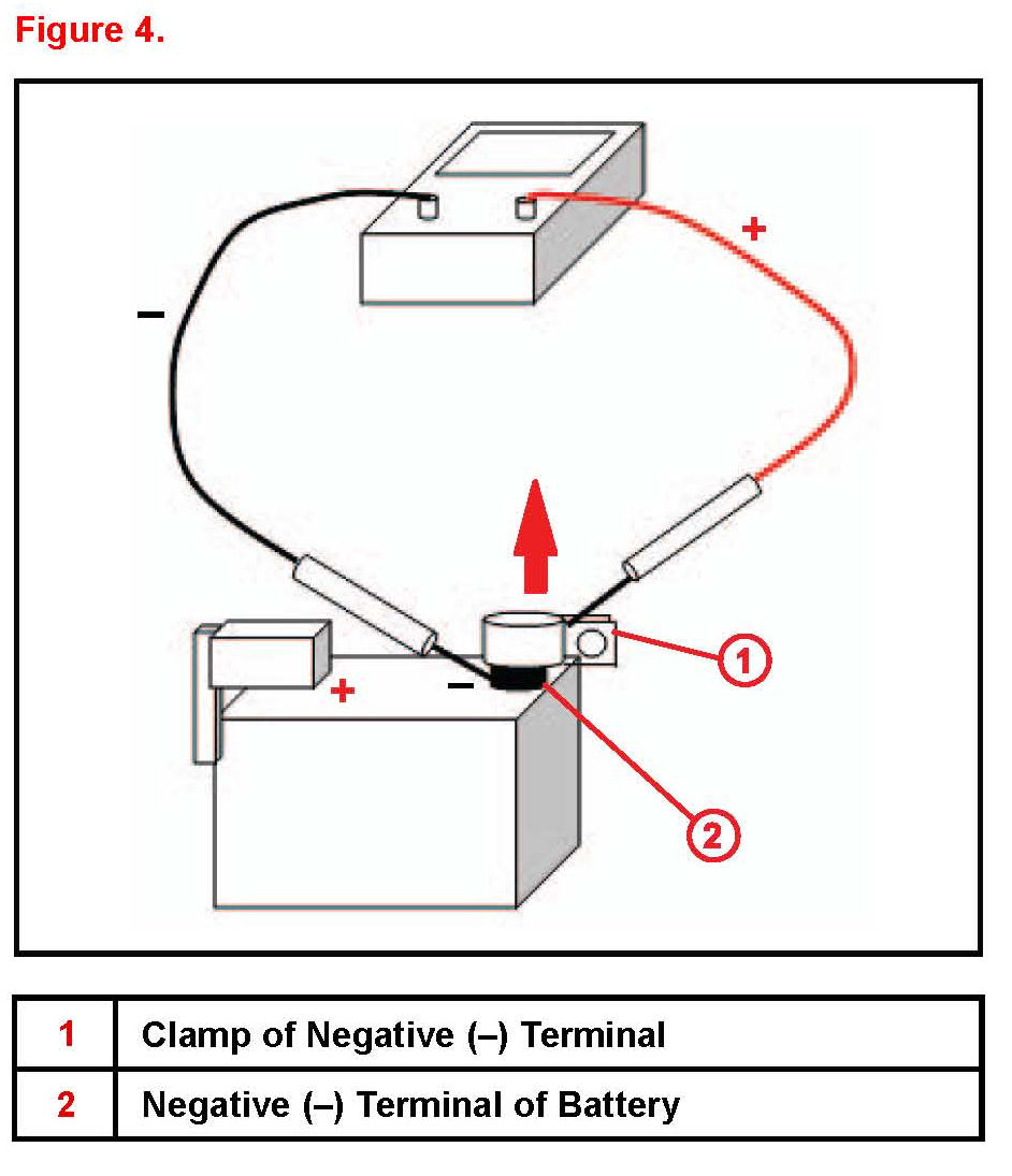 D. Place the negative (-) terminal of the multimeter to the negative (-) terminal post of the battery and the positive (+) terminal of the multimeter to the clamp of the negative (-) terminal battery cable (Figure 4).
