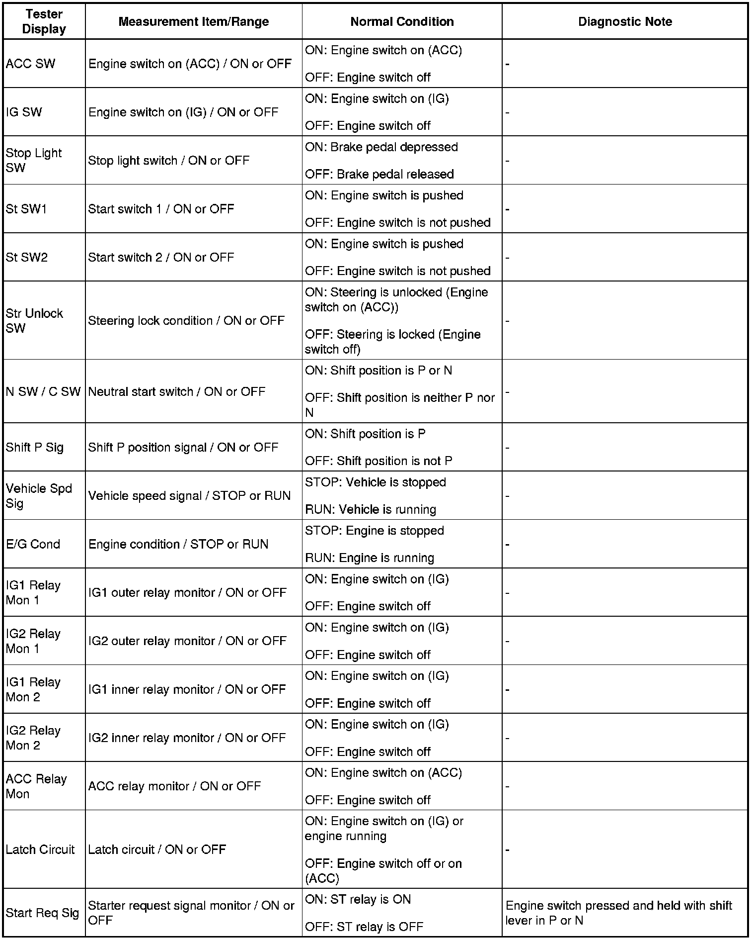 HINT: Using Techstream to read the Data List allows the values or states of switches, sensors, actuators and other items to be read without removing any parts. This non-intrusive inspection can be very useful as intermittent conditions or signals may be discovered before parts or wiring is disturbed. Reading the DATA LIST information early in troubleshooting is one way to save diagnostic time.