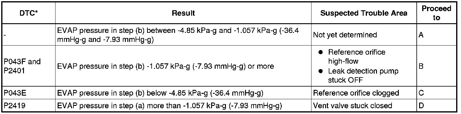 NOTE: If the reference pressure difference between the first and second checks is greater than the specification, all the DTCs relating to the reference pressure (P043E, P043F, P2401, P2402 and P2419) are stored.