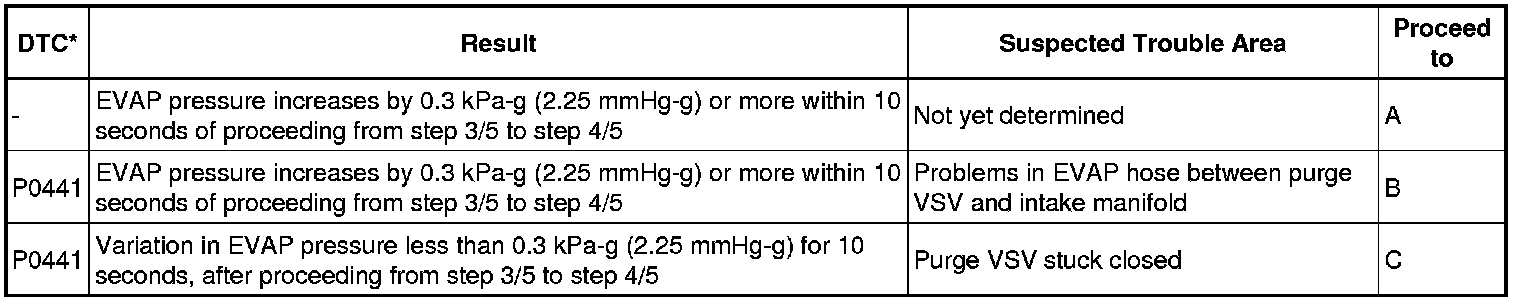 The vent valve is turned ON (closed) and the EVAP pressure is measured. If the variation in the pressure is less than 0.4 kPa-g (3.0 mmHg-g), the ECM interprets this as the purge VSV being stuck closed, illuminates the MIL and sets DTC P0441 (2 trip detection logic).